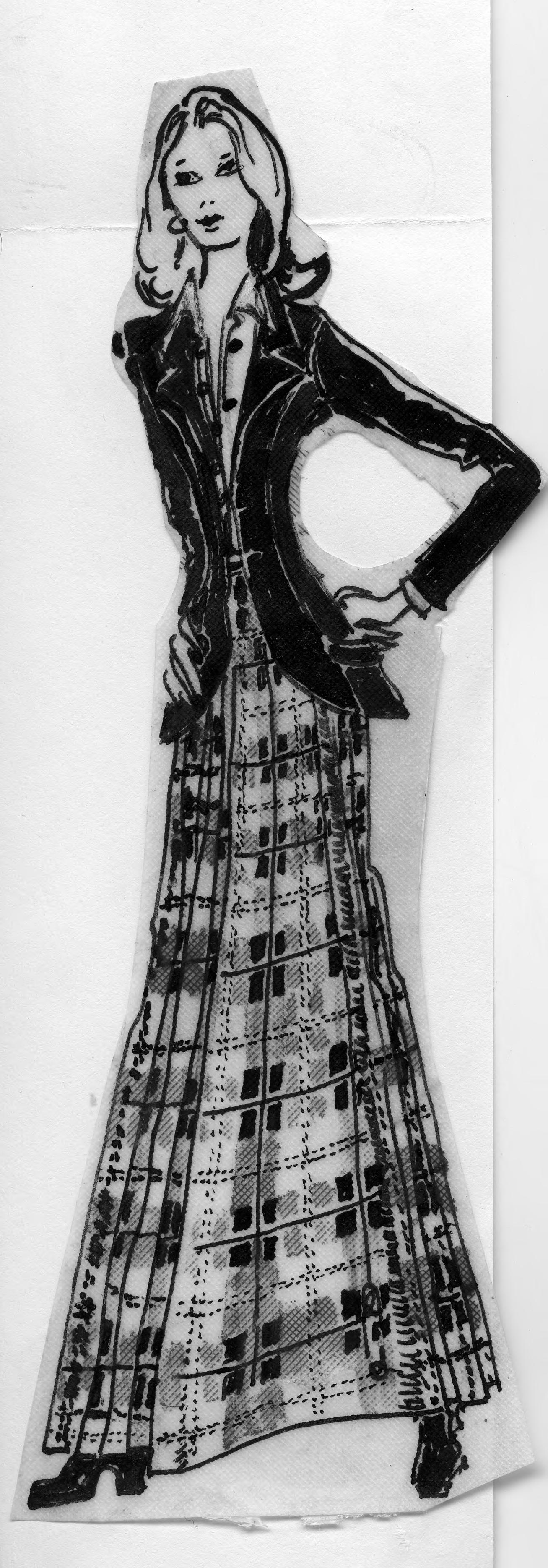 Sketch of a woman wearing dark jacket with princess seams and a curved hemline, and ankle length pleated skirt with checkerboard design. This is the cut-out of an advertisement, and on the back are the words, Season's Greetings.