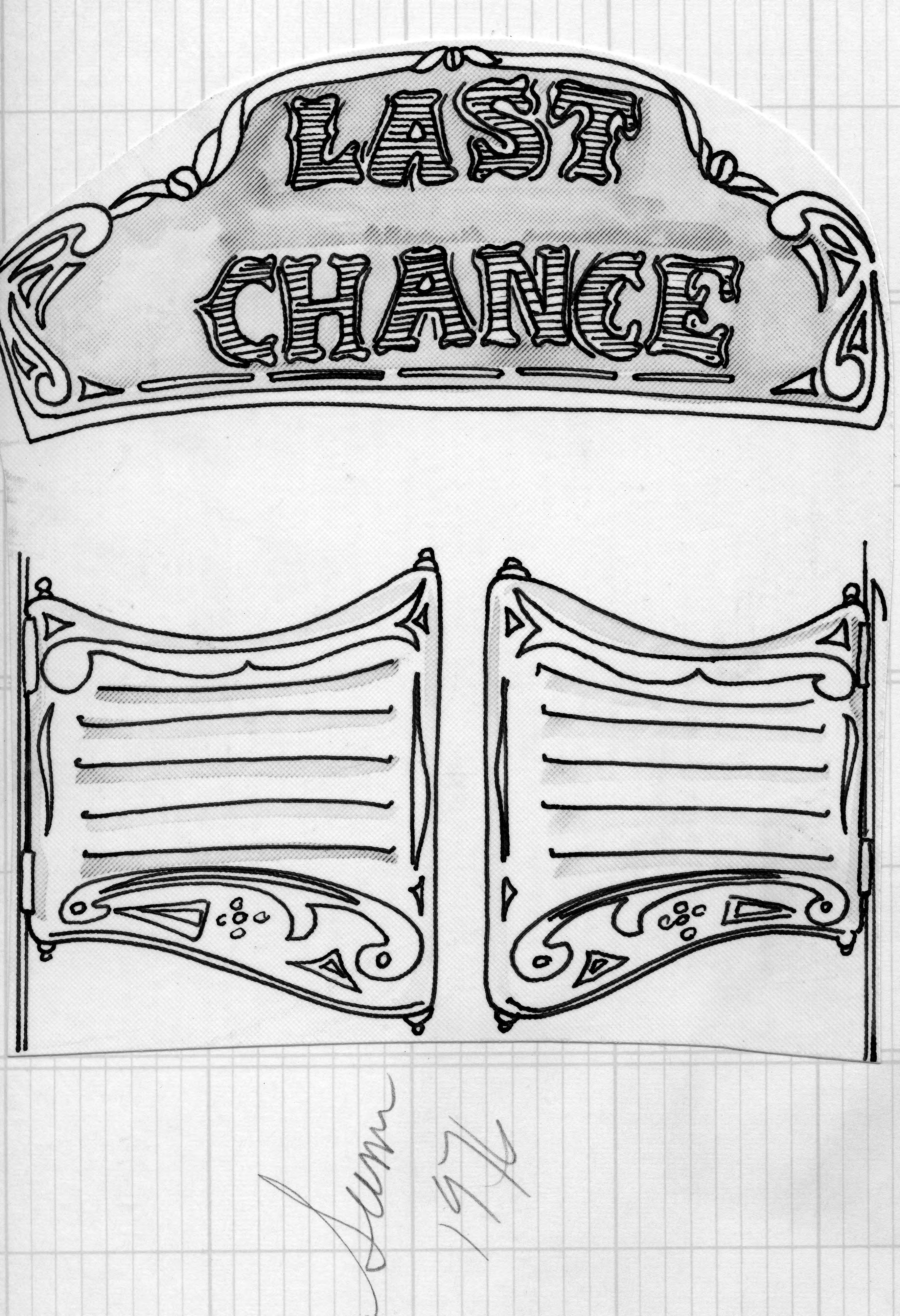 Sketch of saloon doors with an ornate Last Chance sign above them. Summer 1976 is handwritten below the cut out of the advertisement. There are no clothes depicted here.