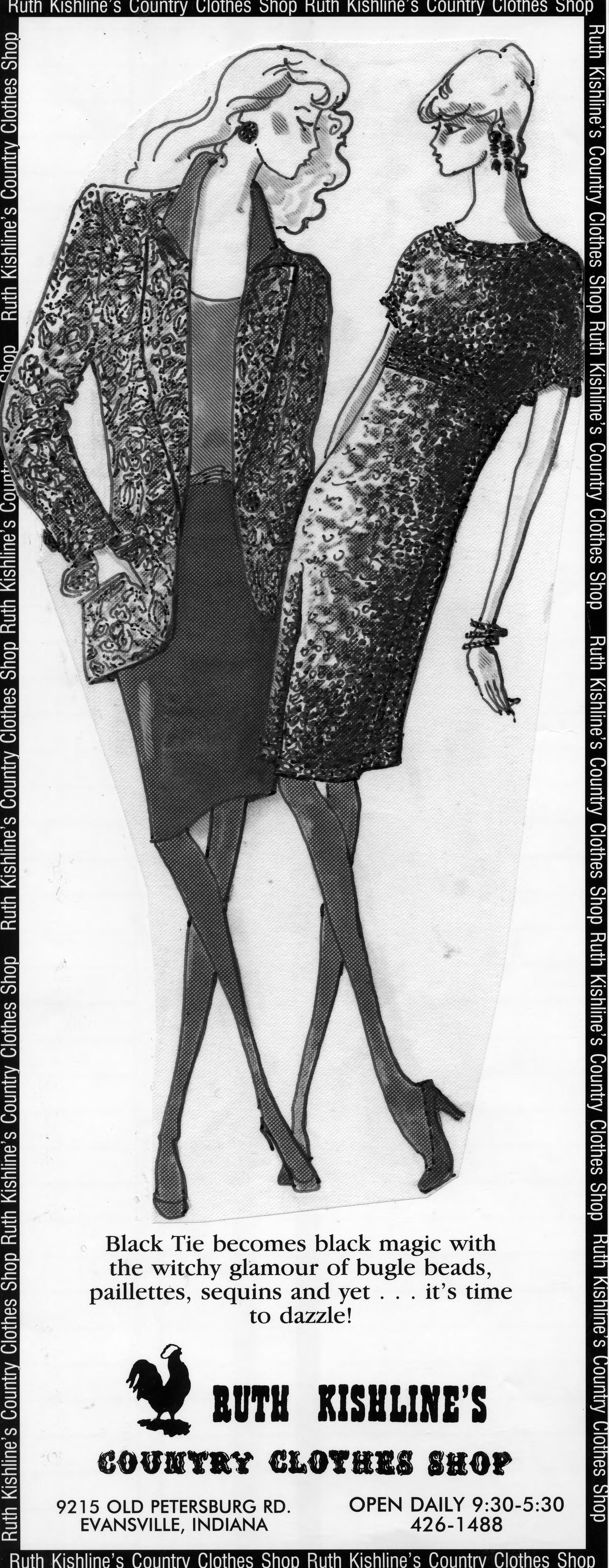 Sketch of 2 women wearing a jacket with skirt and a short sleeved dress. This is the cut out of the advertisement, and the copy reads, Black Tie becomes black magic with the witchy glamour of bugle beads, paillettes, sequins and yet...it's time to dazzle! The text also includes the name of the store, the address, and regular hours. The date of 12-1-91 is written on the back.