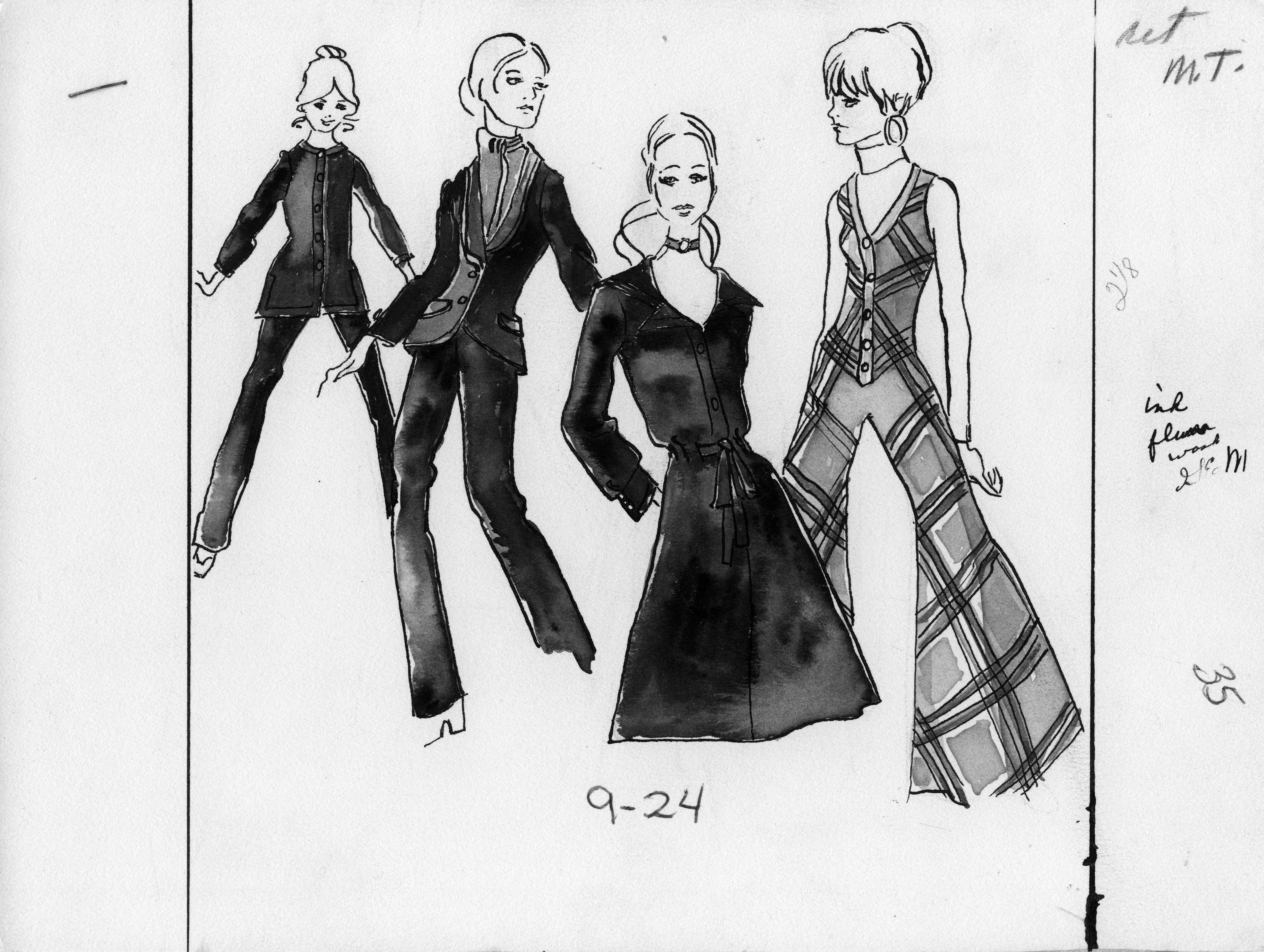 Sketch of 4 women wearing Winter weight pantsuits (one of which is a large plaid) and a dress with a choker necklace. The text on the back, possibly the advertising copy, reads, From Glen of Michigan, a fashion assemblage of velvet and wool tartan plaid called Scotch on the Rocks --Cheers! Bill Atkinson was an architect who got into the fashion business purely by accident. He made a square dance outfit for his wife from eight bandannas. The outfit was so popular that he started making them to sell. This venture was very successful, and he soon found a housedress maker, Glen Manufacturing, to make the skirt. This was in 1950. For twenty years, Glen of Michigan made Bill Atkinson�s casual sportswear designs. ( https://vintagefashionguild.org/label-resource/atkinson-bill/)