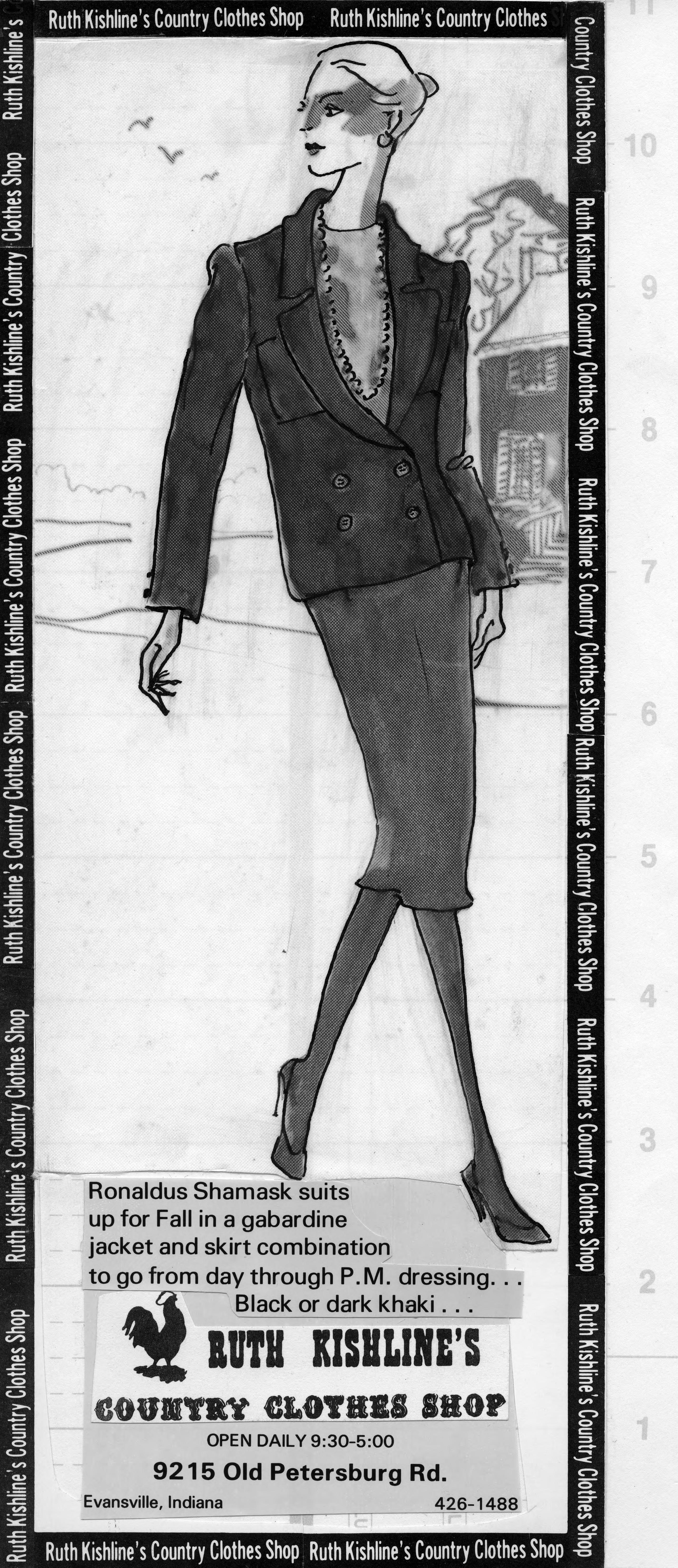 Sketch of a woman wearing a boxy business jacket with skirt. This is the cut out of the advertisement, and the copy reads, Ronaldus Shamask suits up for Fall in a gabardine jacket and skirt combination to go from day through P.M. dressing...black or dark khaki... The text also includes the name of the store, the address, and regular hours. The date of August 13, 1989 is stamped on the back. �Ronaldus Shamask was born in Amsterdam, Netherlands, on 24 November 1945. He moved to Australia with his parents as a teenager and worked in window display for Australian department stores before heading to London, UK in his early twenties. While pursuing painting in his spare time, Shamask worked as a fashion illustrator for The Times and The Observer. In 1968, he was invited to visit the United States by a multimedia artists� organization called The Company of Man, based in Buffalo in upstate New York. Shamask then spent three years as part of this group, designing sets and costumes for ballet and theater. In 1978, Shamask and a partner, Murray Moss, founded a company and studio-cum-retail store in New York called Moss on Madison Avenue. The studio/store featured Shamask�s first couture collection, which was received with plaudits from virtually every fashion publication and cited for its unique approach to clothing construction. Inspired in part by the simple shapes of traditional Japanese clothing, along with his experience in designing stage sets and costumes, Shamask experimented with the way that seams could be used to form shapes out of fabric and designed clothes that literally emphasized their own construction. �Intimate architecture� was one of the phrases used to describe this groundbreaking approach�and was the title of an exhibit of contemporary clothing design that featured his works at the Massachusetts Institute of Technology in 1982. By that time, he had already received the prestigious Coty American Fashion Critics� Award for women�s wear. In 1985, Shamask introduced a menswear collection, and would go on to receive other awards for both his men�s and women�s collections, including the CFDA (Council of Fashion Designers of America) award in 1987. Through the years, his designs took on a more fluid, less rigidly constructed look, sometimes mixing patterns and fabrics within a single garment while hiding the connections between one type of fabric and the other. His color palette ranged from neutral shades of gray, taupe, and beige to stark black, white, and red. By 1996, he had launched his own company, called SHAMASK, and continued to sell his clothes through the most upscale venues such as Neiman Marcus and Takashimaya. He has also maintained his connection to the theater and dance worlds, designing costumes for choreographers Lucinda Childs and Mikhail Baryshnikov, and collaborating with noted jewelry designers whose necklaces, for example, he has incorporated into his dress designs. Shamask�s architectural approach to fashion design has not gone unnoticed in the art world, as his work has been spotlighted in museum exhibits around the globe, including at the Metropolitan Museum of Art (1989, 1996, 1999, and 2003) and the Guggenheim Museum (1997), both in New York; the Kyoto Fashion Institute (1996) in Tokyo; and, most recently, at the Philadelphia Museum of Art, where the exhibit �Ronaldus Shamask: Form, Fashion, Reflection� debuted in 2012.� (https://www.bloomsburyfashioncentral.com/products/fashion-photography-archive/article/ronaldus-shamask)