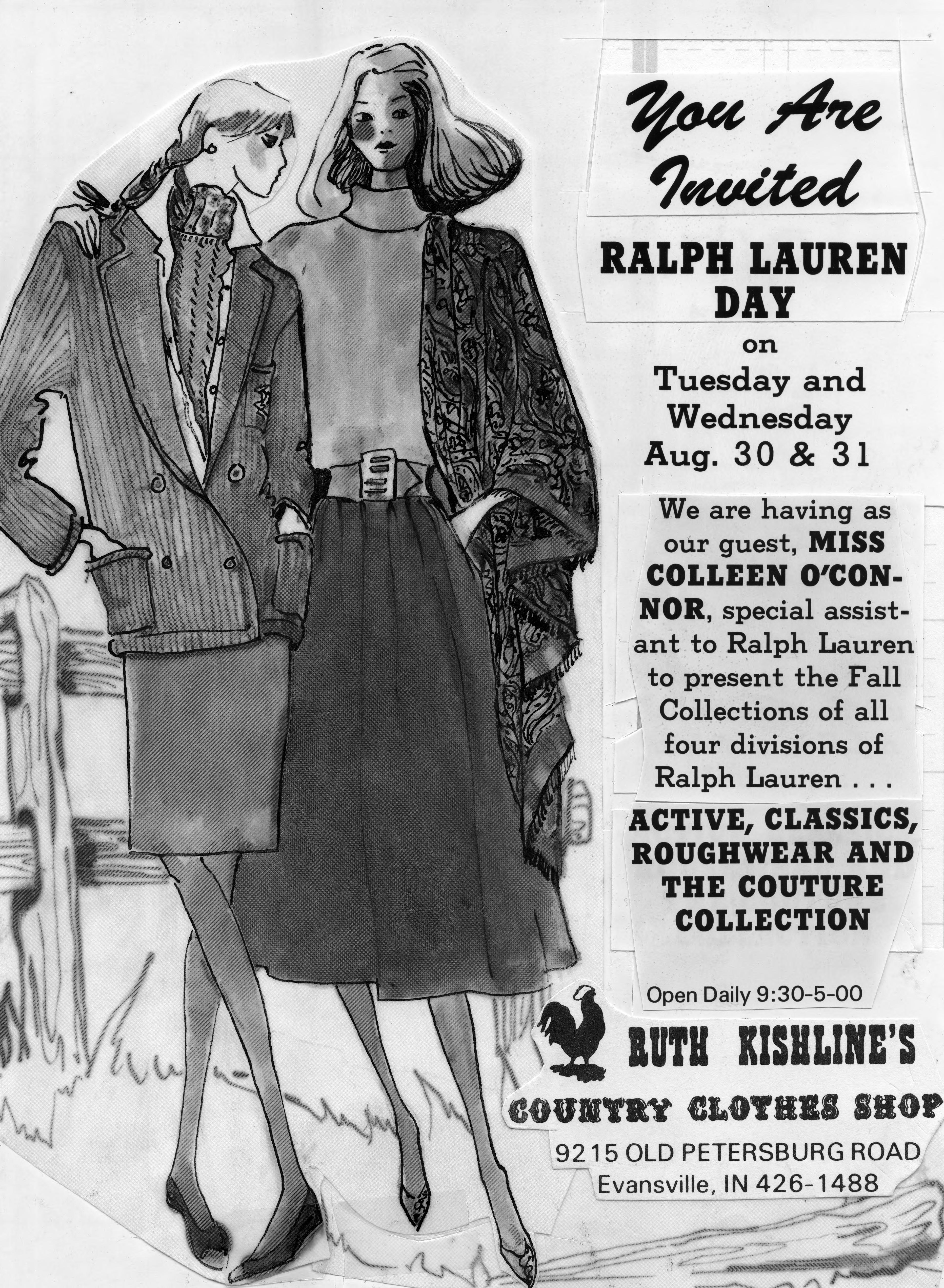Sketch of 2 women wearing a tailored outer jacket with sweaterk top and skirt and a turtleneck and skirt with shawl. This is the cut out of the advertisement, and the copy reads, You are invited Ralph Lauren Day on Tuesday and Wednesday Aug. 30 & 31. We are having as our guest, Miss Colleen O'Connor, special assistant to Ralph Lauren to present the Fall Collections of all four divisions of Ralph Lauren.Active, Classics, Routhwear and The Couture Collection. The text also includes the name of the store, the address, and regular hours. Ralph Lauren (born Ralph Lifshitz; October 14, 1939) is an American fashion designer, philanthropist, and business executive, best known for the Ralph Lauren Corporation, a global multibillion-dollar enterprise. .From 1962 to 1964 he served in the United States Army and left to work briefly for Brooks Brothers as a sales assistant before becoming a salesman for a tie company. The Ralph Lauren Corporation started in 1967 with men's ties. At 28 years old, Lauren worked for the tie manufacturer Beau Brummell, where he convinced the company's president to let him start his own line. Drawing on his interests in sports, Ralph Lauren named his first full line of menswear �Polo' in 1968. He worked out of a single drawer from a showroom in the Empire State Building and made deliveries to stores himself. By 1969, the Manhattan department store Bloomingdale's sold Lauren's men line exclusively. It was the first time that Bloomingdale's had given a designer their own in-store boutique. In 1971, Ralph Lauren Corporation launched a line of tailored shirts for women, which introduced the Polo player emblem to the world for the first time, appearing on the shirt's cuff. The first full women's collection was launched the following year. 1971 also marked the opening of Ralph Lauren's store on Rodeo Drive in Beverly Hills, California. This is the first freestanding store for an American designer. In 1972 the Ralph Lauren Corporation introduced a signature cotton mesh Polo shirt in various colors. Featuring the polo player logo at the chest, the shirt became emblematic of the preppy look--one of Ralph Lauren's signature styles. The tagline for the ad campaign was: Every team has its color � Polo has seventeen.