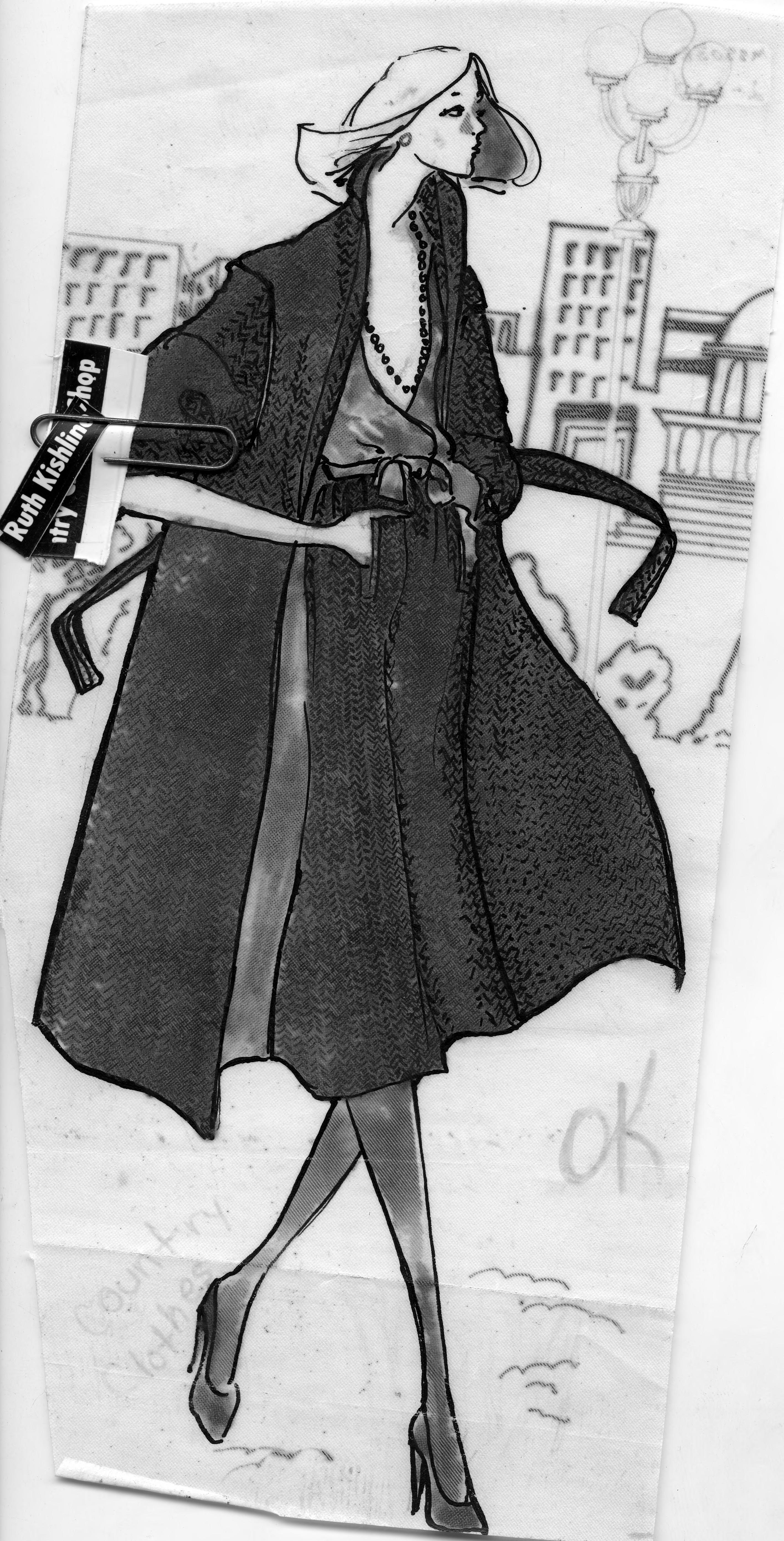 Sketch of a woman wearing a long coat with matching skirt. This is the cut out of the advertisement but there is no copy, nor is it mounted on board like others in this collection.