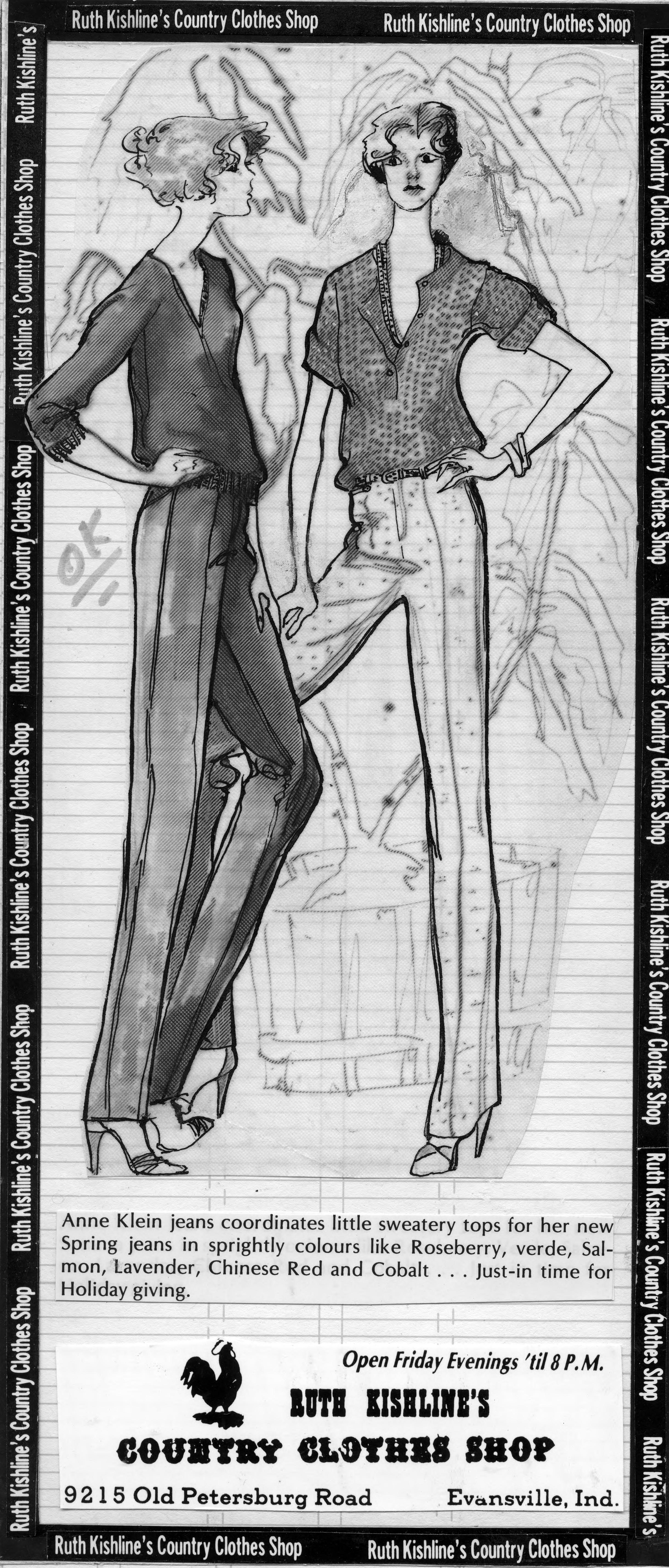 Sketch of 2 women wearing sweaters (one with rolled up sleeves, and pants. This is the cut out of the advertisement, and the copy reads, Anne Klein jeans coordinates little sweatery tops for her new Spring jeans in sprightly colours like Roseberry, verde, Salmon, Lavender, Chinese Red and Cobalt.Just in time for Holiday giving. The text also includes the name of the store, the address, and Friday hours. Anne Klein (August 3, 1923 - March 19, 1974) was an American fashion designer. Her birth name was Hannah Golofsky (it has also been written as Golofski). She changed her first name to Anne, and took Ben Klein's last name when she married him in 1948.. She was the first fashion designer after Coco Chanel to adapt men's clothing styles into how outfits were produced and designed for women.