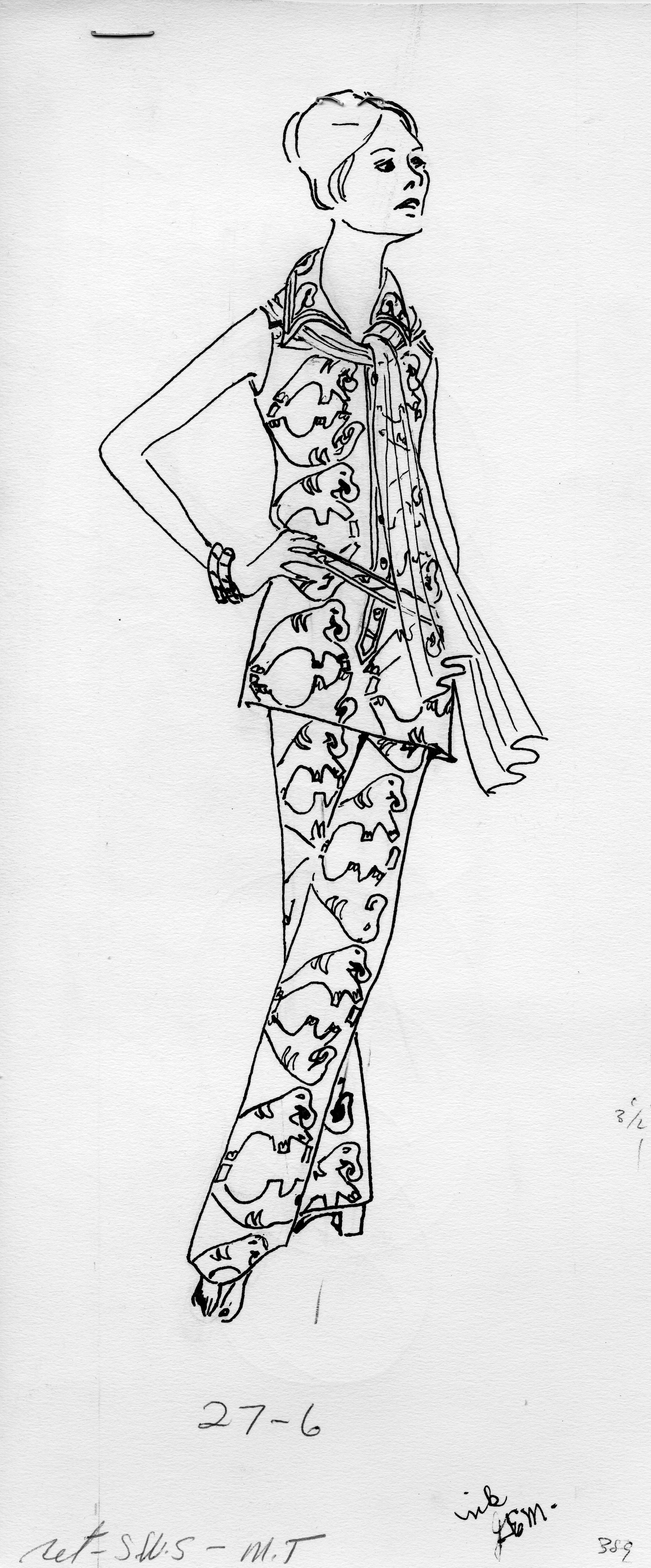 Sketch of a woman wearing a sleeveless pantsuit, with a tunic length top and belt, and a matching scarf around the neck. The legs of the pants appear to be rather full. The text on the back, possibly the advertising copy, reads, Off to the races or home on the patio--the smashiest pantsuit. The Thailand print is a parade of elephants.