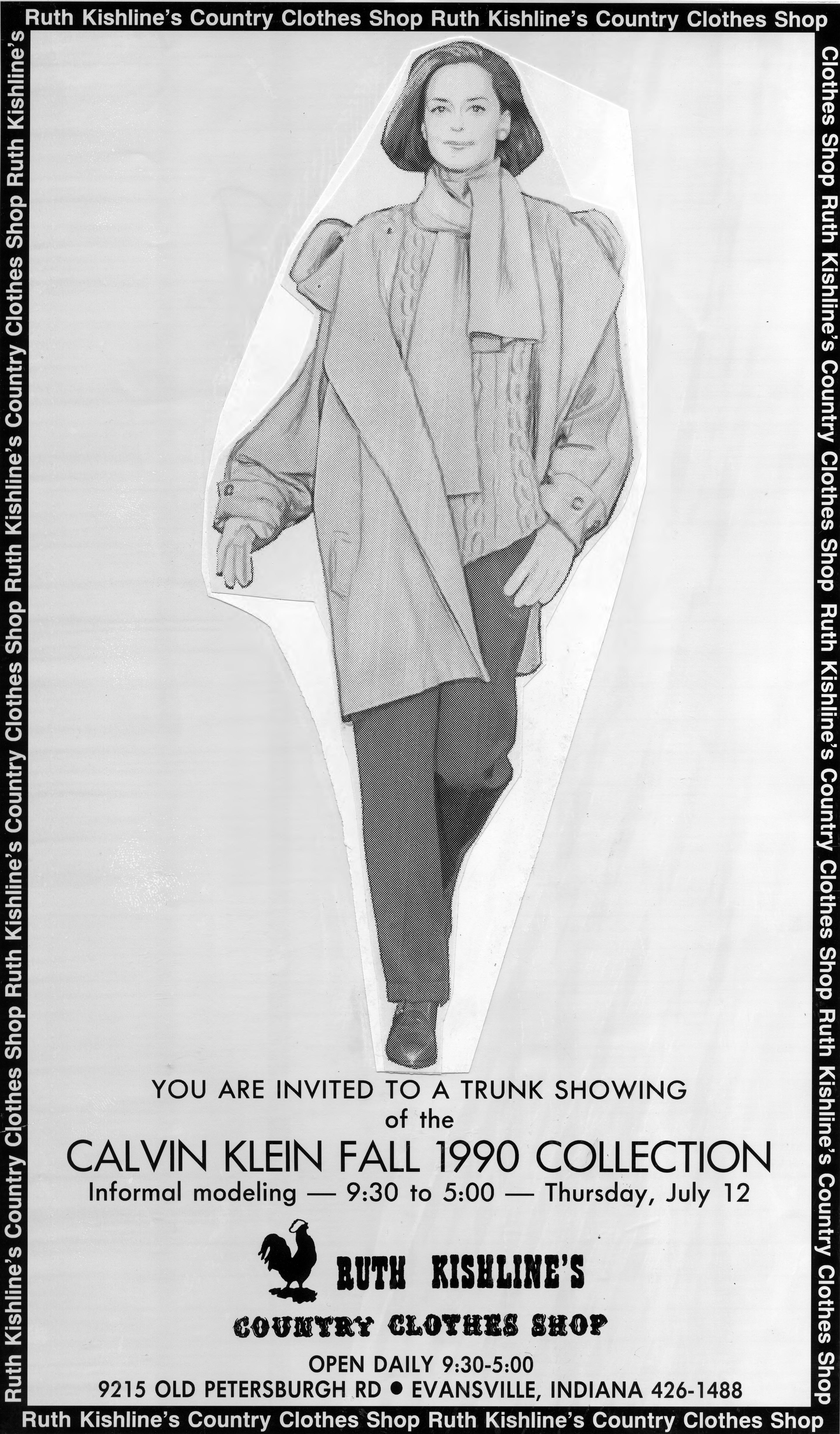 Sketch of a heavy loose coat with sweater and pants. This is the cut out of the advertisement, and the copy reads, You are invited to a trunk showing of the Calvin Klein Fall 1990 collection informal modeling--9:30 to 5:00--Thursday, July 12. The text also includes the name of the store, the address, and regular hours. The July 8, 1990 is stamped on the back. Calvin Klein is a global lifestyle brand that exemplifies bold, progressive ideals and a seductive, and often minimal, aesthetic. We seek to thrill and inspire our audience while using provocative imagery and striking designs to ignite the senses. After nearly 50 years, Calvin Klein continues to be a cultural catalyst across the globe by embracing tension, sparking ideas and creating unforeseen realities. We believe in a culture that provokes discovery and brave thinking. We strive to make a positive impact on the world. We inspire passion in our people. We embody authenticity and embrace individuality. Founded in 1968 by Calvin Klein and his business partner Barry Schwartz, we have built our reputation as a leader in American fashion through our clean aesthetic and innovative designs. Global retail sales of Calvin Klein products exceed $8 billion in 2015 and were distributed in [over] 110 countries. Calvin Klein employs over 10,000 associates globally. In 2003, we were acquired by PVH Corp., one of the largest apparel companies in the world. With a history going back over 130 years, PVH has excelled at growing brands and businesses with rich American heritages, becoming one of the largest global apparel companies. We have over 30,000 associates operating in over 40 countries with over $8 billion in revenues. We own the iconic Calvin Klein, Tommy Hilfiger, Van Heusen, IZOD, ARROW, Speedo*, Warner�s and Olga brands and market a variety of goods under these and other nationally and internationally known owned and licensed brands. (https://explore.calvinklein.com/en_US/corporate)