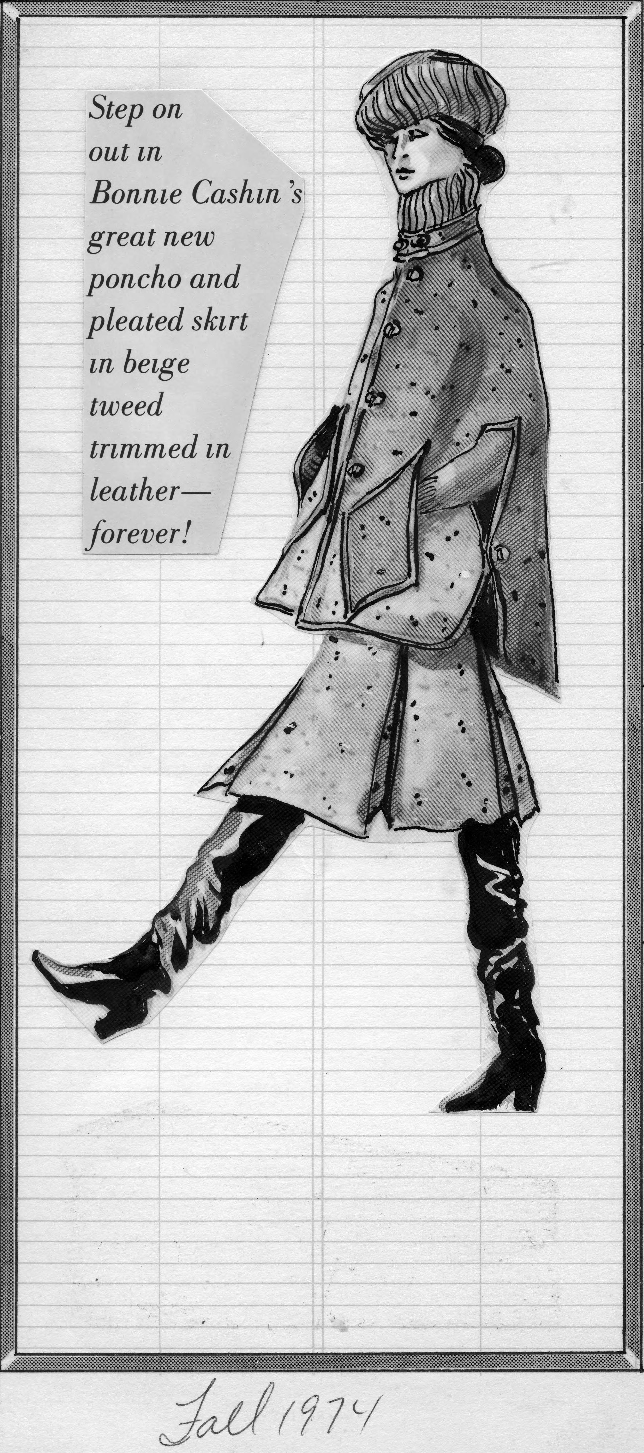 Sketch of a woman wearing a poncho and pleated skirt of the same fabric, with a turtleneck sweater, hat, and knee high boots. The skirt is just below the knee in length. This is a cut-out of the advertisement, and the copy reads, Step on out in Bonnie Cashin's great new poncho and pleated skirt in beige tweed trimmed in leather--forever! Bonnie Cashin (September 28, ca. 1908� February 3, 2000) was an American designer and is considered one of the pioneering designers of American sportswear. She created practical, uncomplicated clothing that catered to the independent woman of the post-war era. . Cashin is often cited creating both the concept of layering clothing and for coining the term. The idea of layering came from time she spent in Asia. Her use of leather, mohair and hardware was pioneering and the brass turnlocks that kept the top of her 1940s convertible down became a signature feature of Coach handbags.