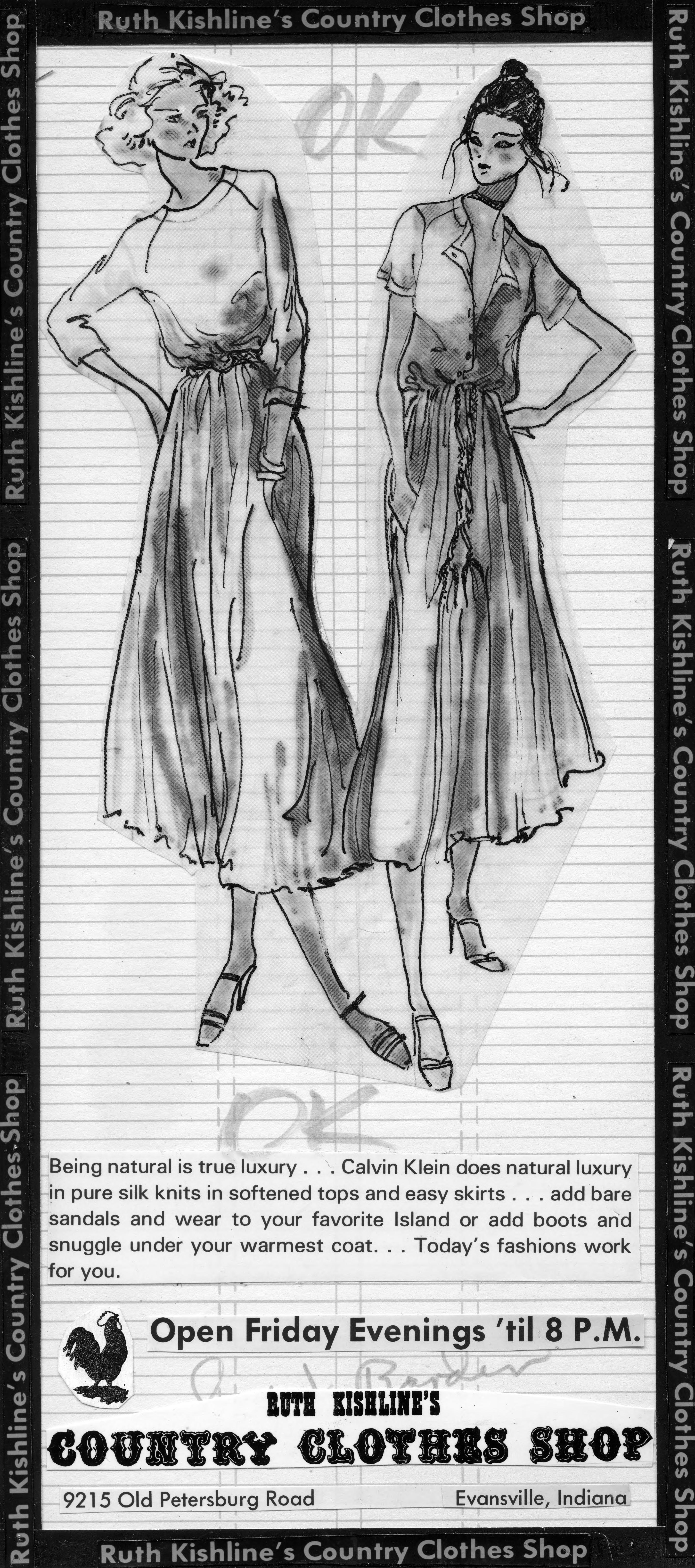 Sketch of 2 women wearing a long-sleeved dress and a short--sleeved one. Both are mid-calf in length. This is the cut out of the advertisement, and the copy reads, Being natural is true luxury...Calvin Klein does natural luxury in pure silk knits in softened tops and easy skirts...add bare sandals and wear to your favorite Island or add boots and snuggle under your warmest coat...Today's fashions work for you. The text also includes the name of the store, address, and Friday hours. On the back is written December 1977 (Cruise wear) Calvin Klein is a global lifestyle brand that exemplifies bold, progressive ideals and a seductive, and often minimal, aesthetic. We seek to thrill and inspire our audience while using provocative imagery and striking designs to ignite the senses. After nearly 50 years, Calvin Klein continues to be a cultural catalyst across the globe by embracing tension, sparking ideas and creating unforeseen realities. We believe in a culture that provokes discovery and brave thinking. We strive to make a positive impact on the world. We inspire passion in our people. We embody authenticity and embrace individuality. Founded in 1968 by Calvin Klein and his business partner Barry Schwartz, we have built our reputation as a leader in American fashion through our clean aesthetic and innovative designs. Global retail sales of Calvin Klein products exceed $8 billion in 2015 and were distributed in [over] 110 countries. Calvin Klein employs over 10,000 associates globally. In 2003, we were acquired by PVH Corp., one of the largest apparel companies in the world. With a history going back over 130 years, PVH has excelled at growing brands and businesses with rich American heritages, becoming one of the largest global apparel companies. We have over 30,000 associates operating in over 40 countries with over $8 billion in revenues. We own the iconic Calvin Klein, Tommy Hilfiger, Van Heusen, IZOD, ARROW, Speedo*, Warner�s and Olga brands and market a variety of goods under these and other nationally and internationally known owned and licensed brands. (https://explore.calvinklein.com/en_US/corporate)