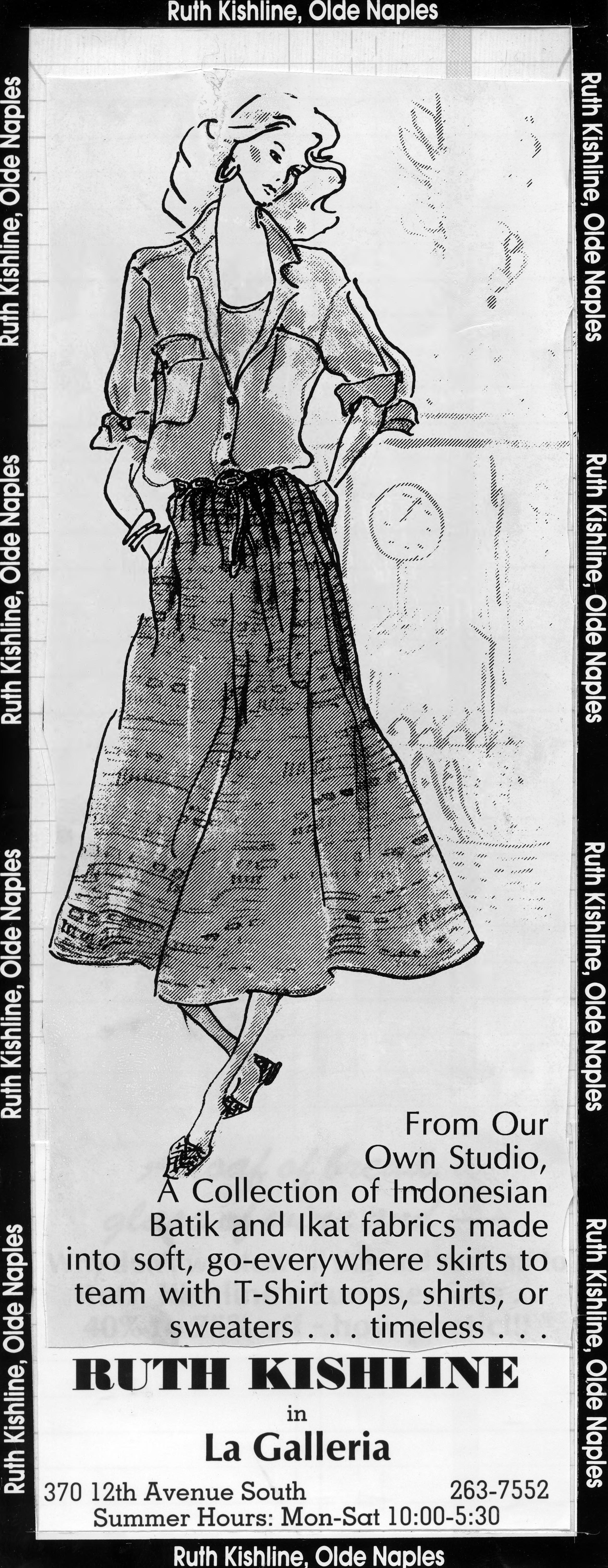 Sketch of a woman wearing a blouse and full skirt with self tie. This is the cut out of the advertisement, and the copy reads, From our own studio, a collection of Indonesian Batik and Ikat fabrics made into soft, go-everywhere skirts to team with T-shirt tops, shirts, or sweaters....timeless... Kishline at one time also had a store in Naples, Florida and this advertisement bears that address: Ruth Kishline in La Galleria 370 12th Avenue South 263-7552, summer hours: Mon.-Sat. 10:00-5:30. The date of May 20, 1990 is stamped on the back.