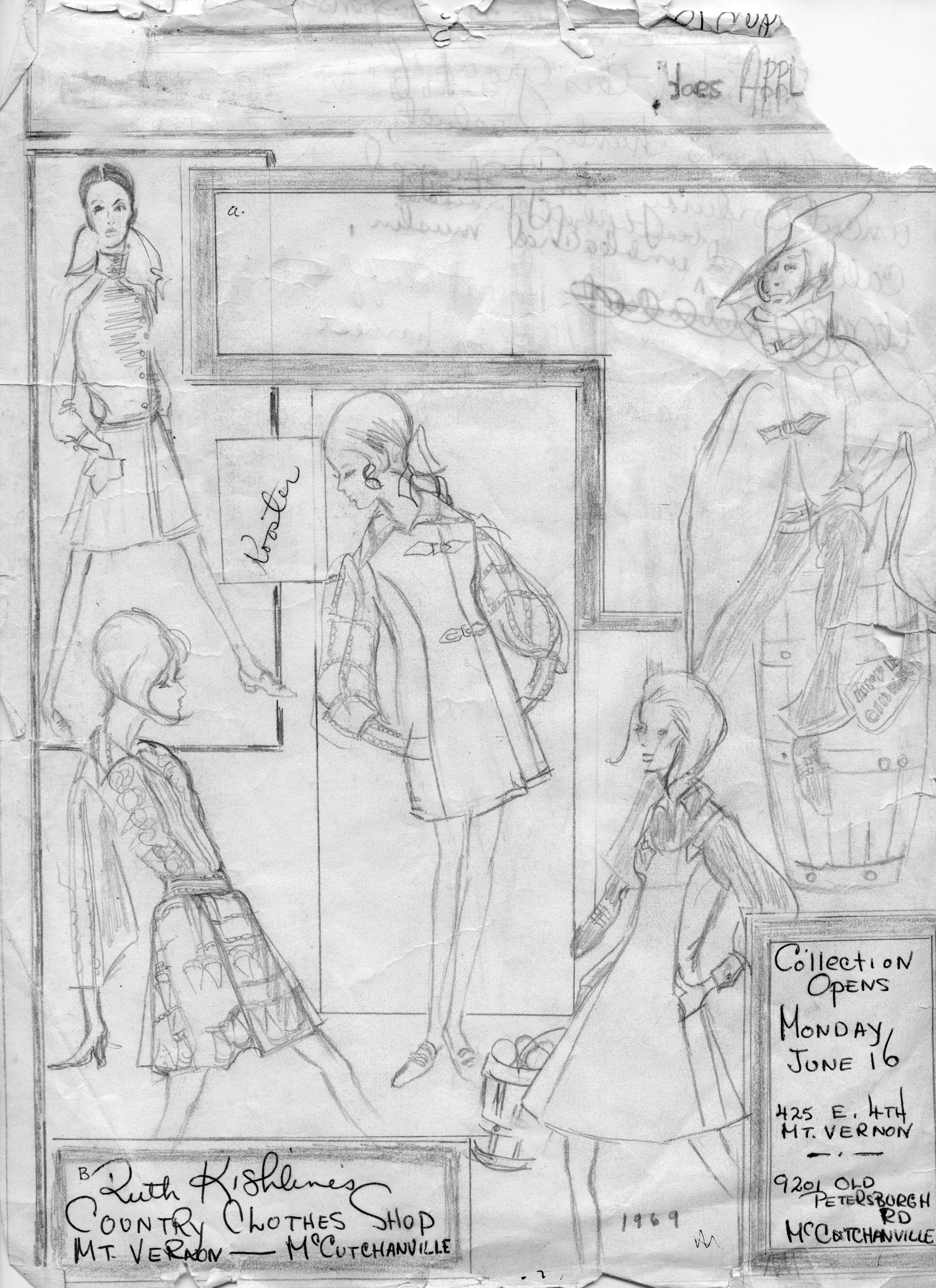 Sketches of a 4 women wearing various Fall weather ensembles. Text on the front provides store and date information for this: Ruth Kishline Country Clothes Shop Mt. Vernon--McCutchanville. Collection opens Monday June 16 [at] 425 E. 4th Mt. Vernon [or] 9201 Old Petersburgh Rd. McCutchanville. The word Rooster is written across part of the illustration, probably suggesting that a picture of a rooster be inserted there (a rooster was part of the store's logo). The text on the back, possibly the advertising copy, reads, [missing text]...for this group of collectables is hunting velvet, uncut corduroy, tiny sprigged calico, and beautifully embroidered unbleached muslin. Great stuff every piece...a fashion harvest. Come have a barrelful.