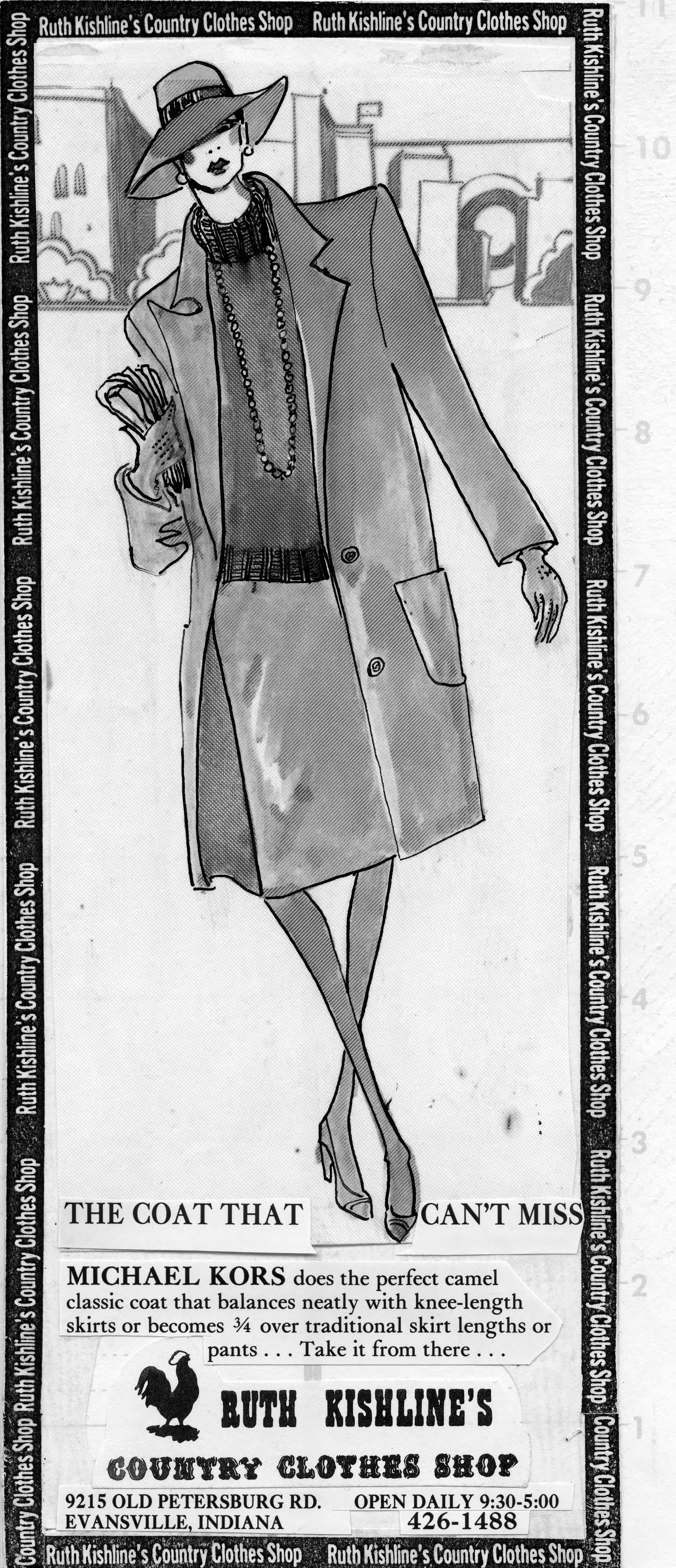 Sketch of a woman wearing a turtleneck sweater and skirt with an overcoat and hat, carrying gloves. This is the cut out of the advertisement, and the copy reads, The coat that can't miss. Michael Kors does the perfect camel classic coat that balances nearly with knee length skirts or beomes 3/4 over traditional skirt lengths or pants.take it from there. The text also includes the name of the store, the address, and regular hours. The date of November 13, 1988 is stamped on the back. � Michael David Kors (born Karl Anderson Jr.; August 9, 1959) is an American fashion designer. He is the chief creative officer of his brand, Michael Kors, which sells men's and women's and ready-to-wear, accessories, watches, jewelry, footwear and fragrance. Kors was the first women's ready-to-wear designer for the French house Celine, from 1997 to 2003. On January 2, 2019 Michael Kors Holdings Limited officially changed its name to Capri Holdings Limited (NYSE: CPRI), of which Michael Kors is the Honorary Chairman and Director. Michael Kors, Jimmy Choo and Versace are the three founder-led brands under Capri Holdings Limited.�