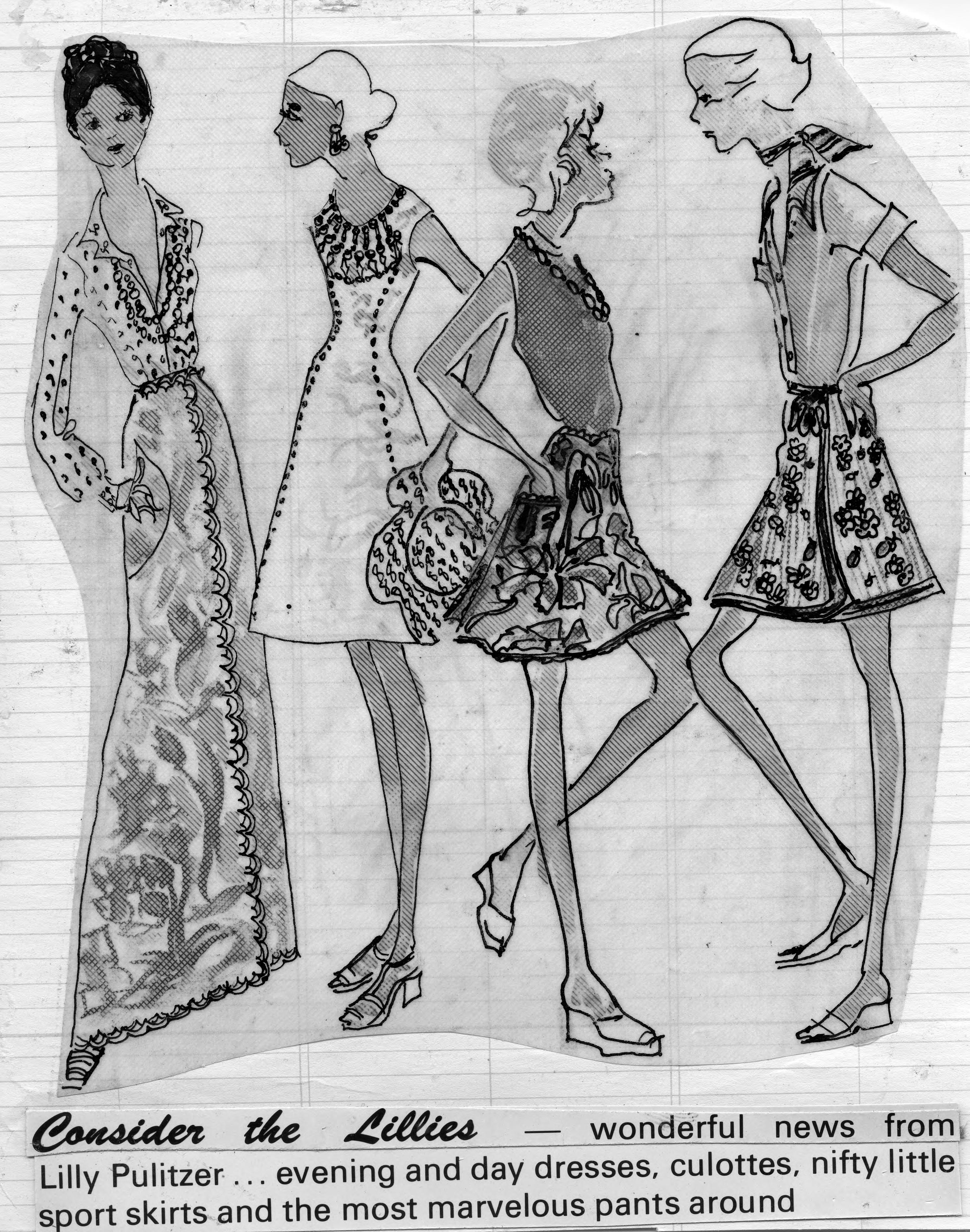 Sketch of 4 women wearing Summer outfits--an ankle-length skirt with ruffled front and hem, paired with a light weight long sleeved blouse and necklace, and a knee length, sleeveless, princess seamed dress with beaded neckline. The other 2 outfits are above the knee wrap skirts and tops (one sleeveless, one with short cuffed sleeves. This is the cut-out of the advertisement, and the copy reads, Consider the Lilies--wonderful news from Lilly Pulitzer.evening and day dresses, culottes, nofty little sport skirts and the most marvelous pants around. Lillian Pulitzer Rousseau (born Lillian Lee McKim; November 10, 1931 - April 7, 2013), better known as Lilly Pulitzer, was an American socialite and fashion designer. She founded Lilly Pulitzer, Inc., which produces clothing and other such wares featuring bright, colorful, floral prints. As the brand is popular with high society, she was called the Queen of Prep . .Born to an heiress of the Standard Oil fortune, she married Herbert Pulitzer Jr. (known as Peter), the grandson of Joseph Pulitzer; the publisher and founder of the Pulitzer Prize. Lilly and husband Peter Pulitzer settled in Palm Beach, Florida, shortly after their marriage. They owned several Florida citrus orange groves and, with produce from the groves, she opened a fruit juice stand on Via Mizner, just off Worth Avenue in Palm Beach. While working at the stand, Pulitzer found that squeezing juice made a mess of her clothes. Seeking to camouflage the juice stains, she designed a sleeveless shift dress made of bright, colorful printed cotton. She discovered that customers loved her dress, so she produced more to sell at her juice stand. Eventually, she was selling more dresses than juice, and decided to focus on designing and selling what had become known as her Lillys . In 1959, Pulitzer became president of her own company, Lilly Pulitzer, Inc. The company's main factory was in Miami, Florida and the fabrics were produced by the Key West Hand Print Fabrics company in Key West. From the 1960s to the early 1980s, Pulitzer's bright, colorful clothes were very popular, worn by elites such as Jacqueline Kennedy Onassis, Caroline Kennedy, and members of the Rockefeller, Vanderbilt and Whitney families. Lilly Pulitzer was a former classmate of Jackie's. After Jackie was featured in Life magazine donning one of Lilly's famous shifts, many preppy ladies followed her lead. The Jacqueline dress is one of Lilly Pulitzer's most successful styles. By 1984, Lilly closed down the entire clothing operation. Lilly later stated that the first shift dress her former classmate, Jacqueline Kennedy Onassis was photographed in, was made of kitchen curtains.