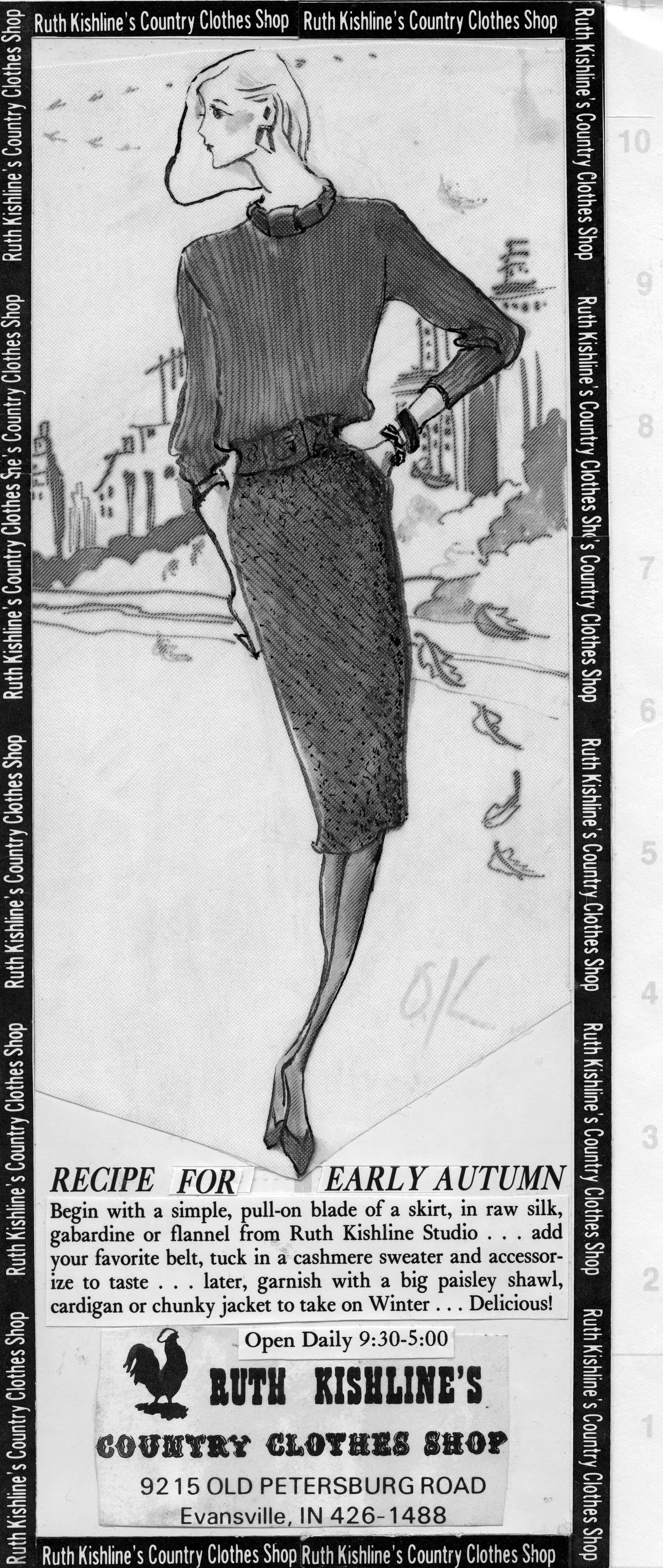 Sketch of a woman wearing long sleeved top with straight skirt. This is the cut out of the advertisement, and the copy reads, Recipe for early Autumn. Begin with a simple, pull on blade of a skirt, in raw silk, gabardine or flannel from Ruth Kishline Studio...add your favorite belt, tuck in a cashmere sweater and accessorize to taste...later, garnish with a big paisley shawl, cardigan or chunky jacket to take on Winter...Delicious! The text also includes the name of the store, the address, and regular hours. The date of August 21, 1988 is stamped on the back.