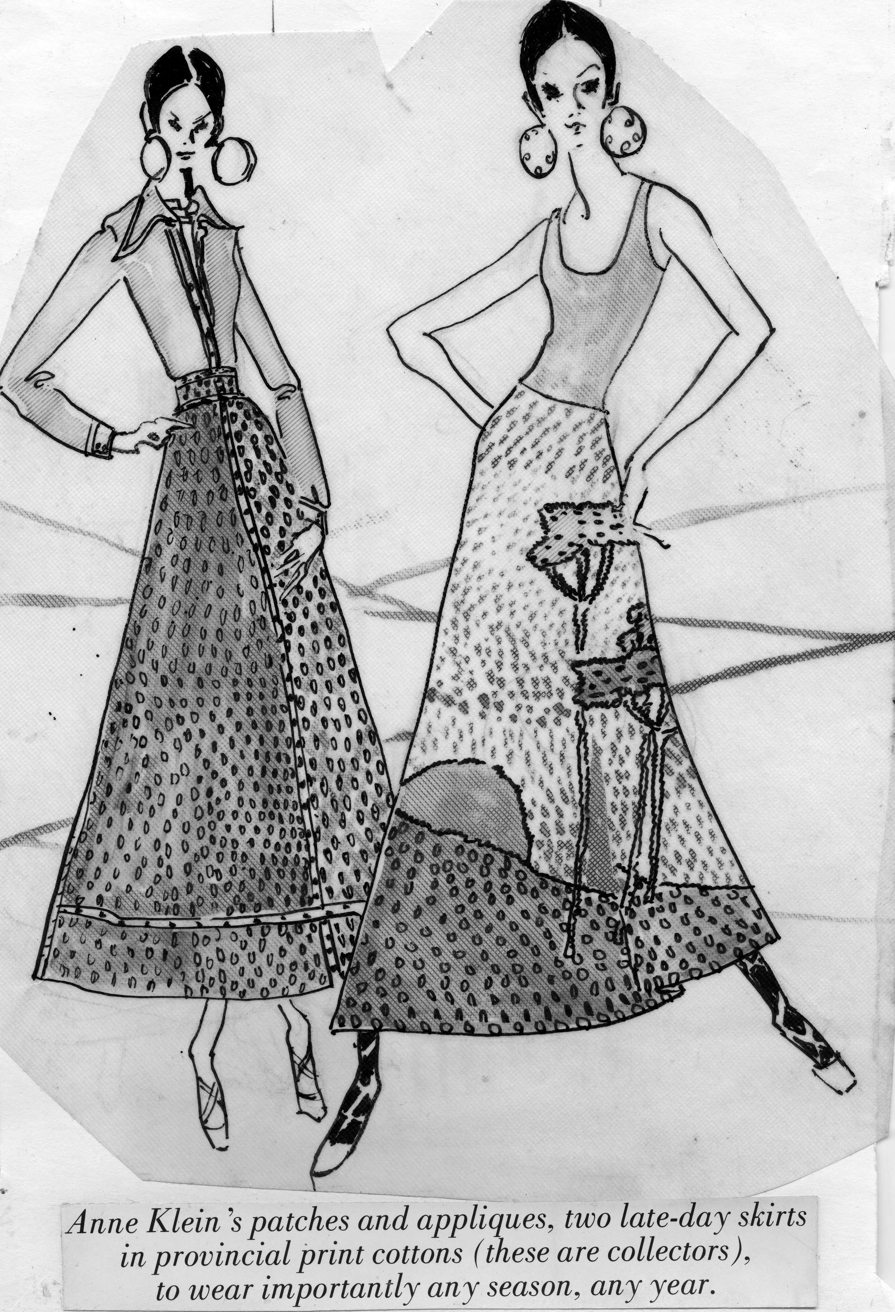 Sketch of 2 women wearing just above the ankle length shirts, one with a tank top and the other with a long sleeved shirt. This is the cut-out of the advertisement, and the copy reads, Anne Klein's patches and appliques, two late-day skirts in provincial print cottons (these are collectors), to wear importantly any season, any year. Anne Klein (August 3, 1923 - March 19, 1974) was an American fashion designer. Her birth name was Hannah Golofsky (it has also been written as Golofski). She changed her first name to Anne, and took Ben Klein's last name when she married him in 1948.. She was the first fashion designer after Coco Chanel to adapt men's clothing styles into how outfits were produced and designed for women.