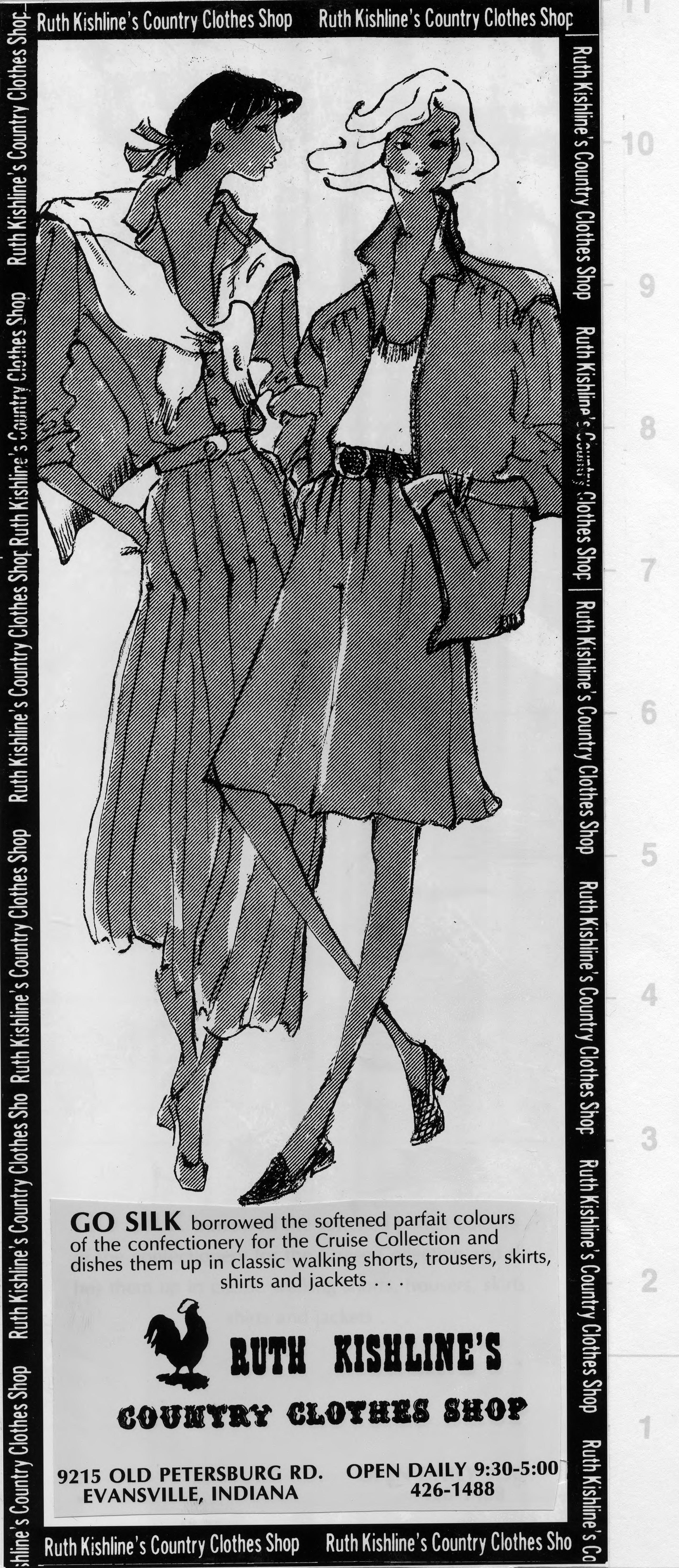 Sketch of 2 women wearing silk dress and jacket and divided skirt with blouse. This is the cut out of the advertisement, and the copy reads, Go silk borrowed the softened parfait colours of the confectionery for the Cruise Collection and dishes them up in classic walking shorts, trousers, skirts, shirts and jackets... The text also includes the name of the store, the address, and regular hours.