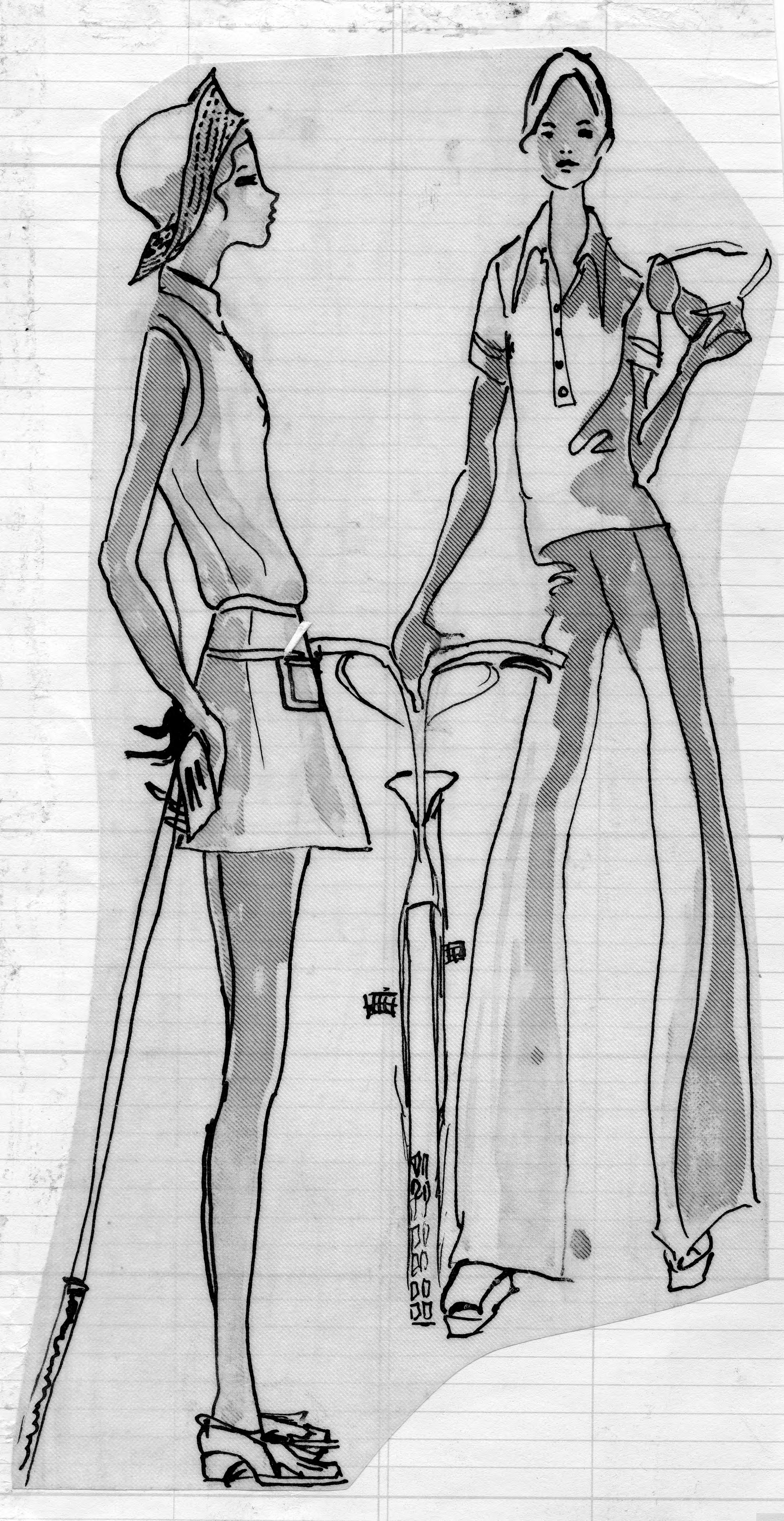 Sketch of 2 women wearing sportswear--the first has on a mini-skirt and sleeveless, collared blouse and a turned up brim cap, and holds a golf club. The other has long pants, a polo top, sunglasses, and holds a bicycle. This is the cut-out of an advertisement.