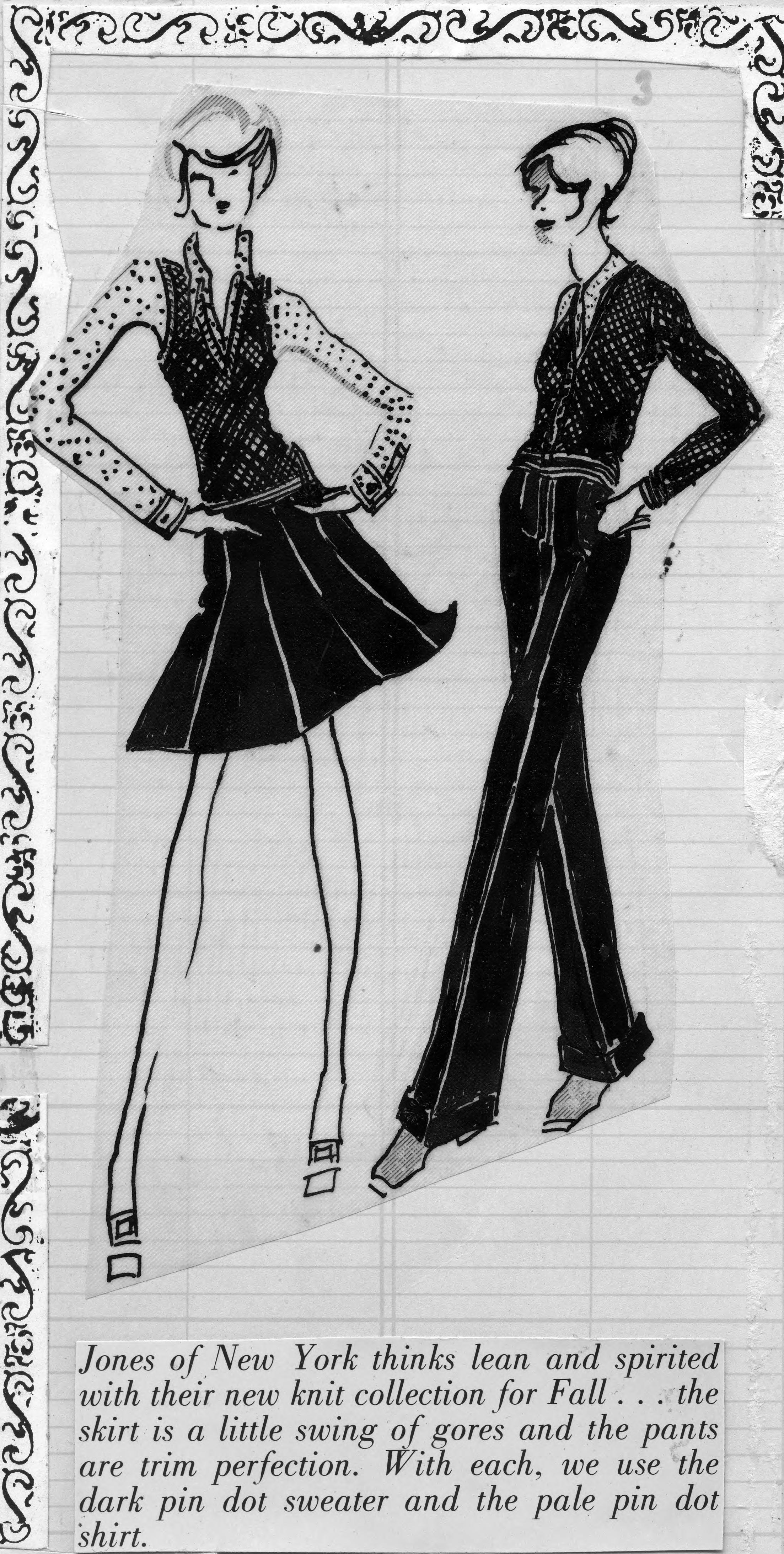 Sketch of 2 women--one with an above the knee length gored skirt and sweater vest over a long sleeved blouse with cuffs. The other has cuffed pants, long-sleeved sweater with decorative hem over the same blouse. This is the cut-out of the advertisement, and the copy reads, Jones of New York thinks lean and spirited with their new knit collection for Fall...the skirt is a little swing of gores and the pants are trim perfection. With each, we use the dark pin dot sweater and the pale pin dot shirt. It began in 1966 with a vision, a passion, and a well-heeled hunch. When founder Sidney Kimmel worked it out that women put the 'force' in workforce. Fast forward 40 years, the Jones New York woman is supporting families, multi-tasking, and balancing complex lives. Jones New York is designed for the modern day woman who is seeking a trusted brand that delivers timeless versatility and complements her individual expression. She does it all, with style and ease. Jones New York is a modern lifestyle brand rooted in classic complemented by on-trend details, clean lines and signature quality. The new collection is designed for a woman who is confident and expressive with a look that is always polished yet casually elegant. (http://www.jny.com/about-us)