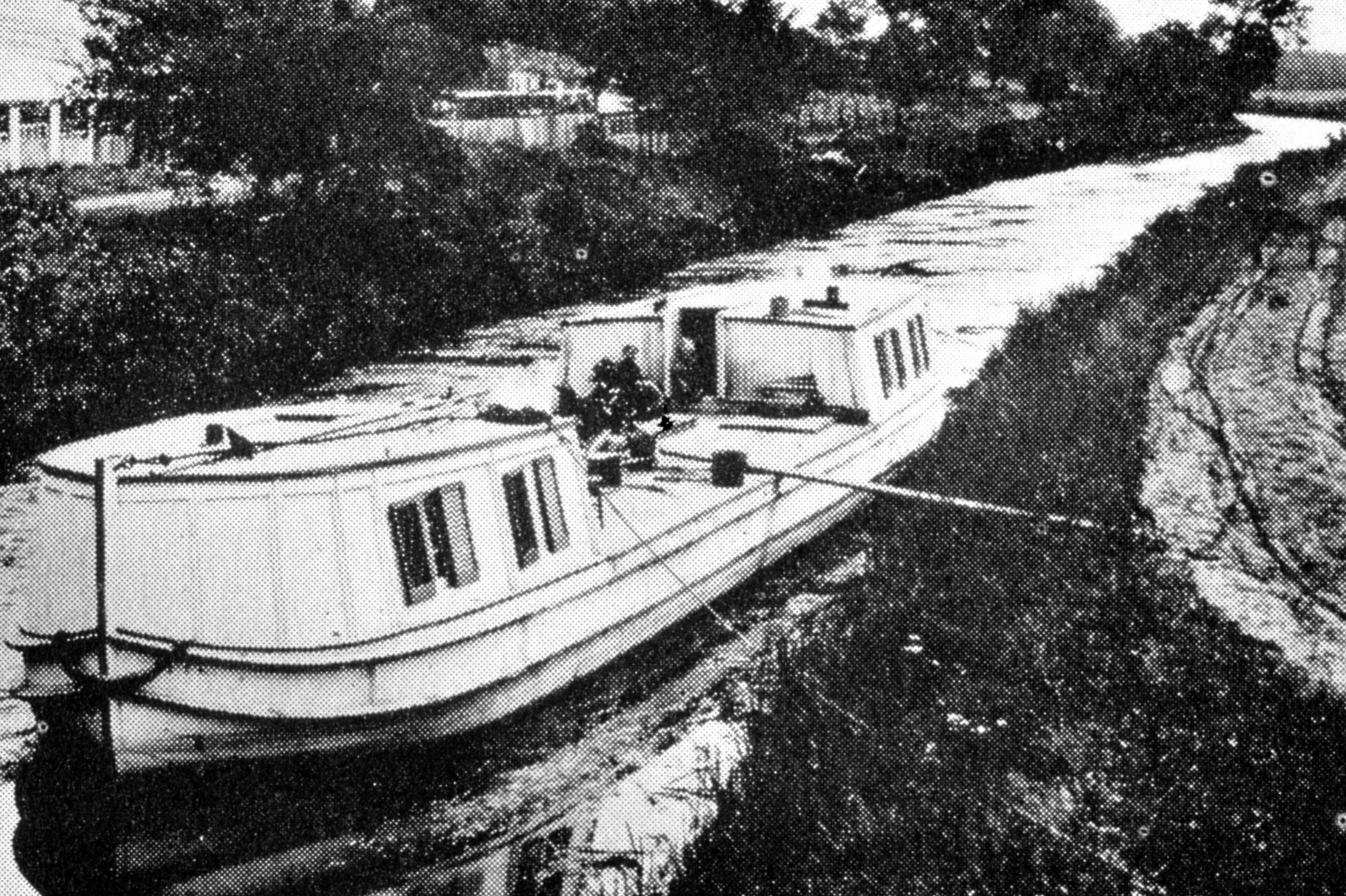 Canal boat at unidentified location, though thought to be in Evansville, IN. The Wabash and Erie Canal did extend through Evansville, connecting the Great Lakes to the Ohio River. Construction on this stretch began in 1836, but was delayed due to the 1840s financial crisis. Construction began again in the mid to late 1840s, and was completed in 1853. Success was very short lived, and this stretch was abandoned in 1861, with the entire canal bed refilled by 1870. For more details, see http://historicevansville.com/wabasheriecanal.php