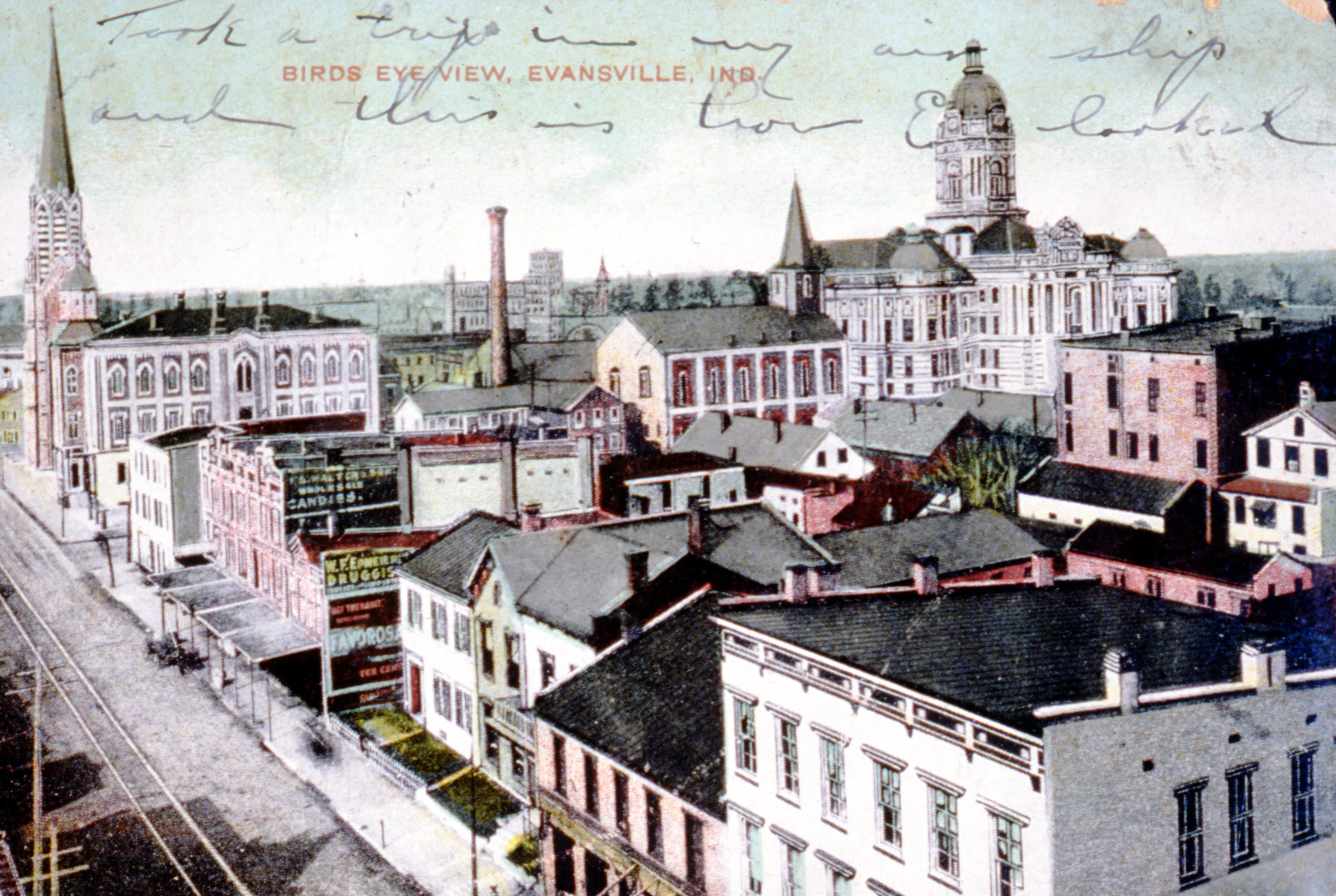 Postcard entitled, Birds Eye View, Evansville, Ind. Someone has written this note across the top, Took a trip in my air ship and this is how E. looked. The Vanderburgh County Courthouse, building with cupola, at 201 NW 4th St. was completed in 1890. The building still stands, but is now referred to as the old courthouse, as government offices moved into another building in 1969. The church spire far left is Holy Trinity Catholic Church at 211 NW 3rd St., completed in 1851. It, a school, a sisters' home, and rectory covered nearly 1/2 block. The church was struck by lightning on Easter Sunday and burned to the ground, April 3, 1950. The church spire that appears to be right across from the courthouse is the German Methodist Episcopal Church at 202 NW 4th St., built in 1865, dedicated in 1867, with a name change to 4th St. Methodist Episcopal Church in 1917. Its congregation merged with another and moved to another location, so in 1937 that building became the courthouse annex. It was razed in 1973. The congregation itself dates back to at least 1842.