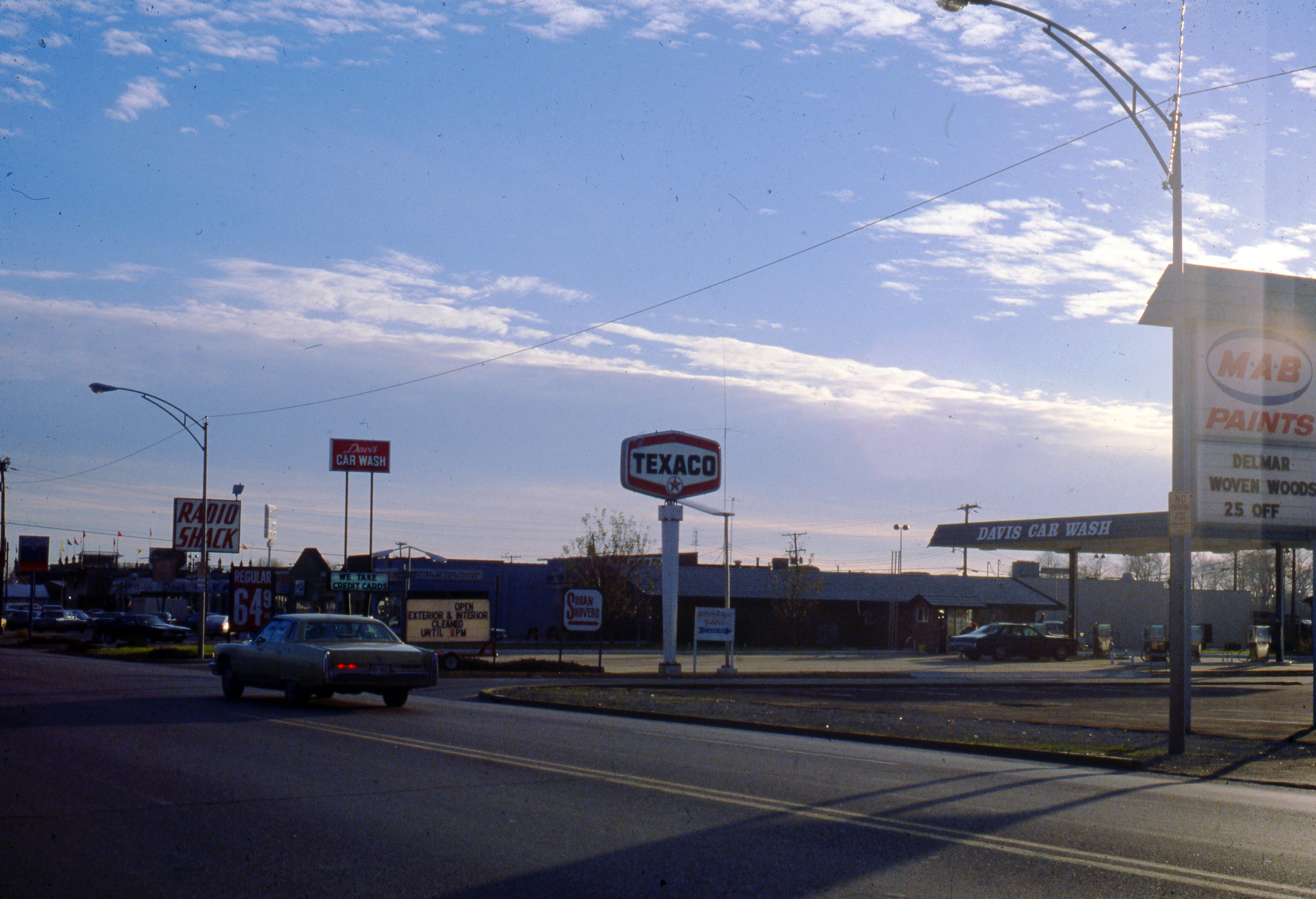 S. Green River Road Rd., near the intersection with Bayard Park Dr., with these businesses: Radio Shack at 809 S. Green River Rd., Davis Car Wash at 805 S. Green River Rd., and M A B Paints at 777 S. Green River Rd. It is thought that the Texaco station is affiliated with the car wash. The car wash building still stands and has housed various car washes, but Davis is no longer in town. There is no gas station at this location. M A B Paints are available in the area, and there are Radio Shack stores still in town. NOTE: MSS 184-0239 shows the businesses to the left of this scene.