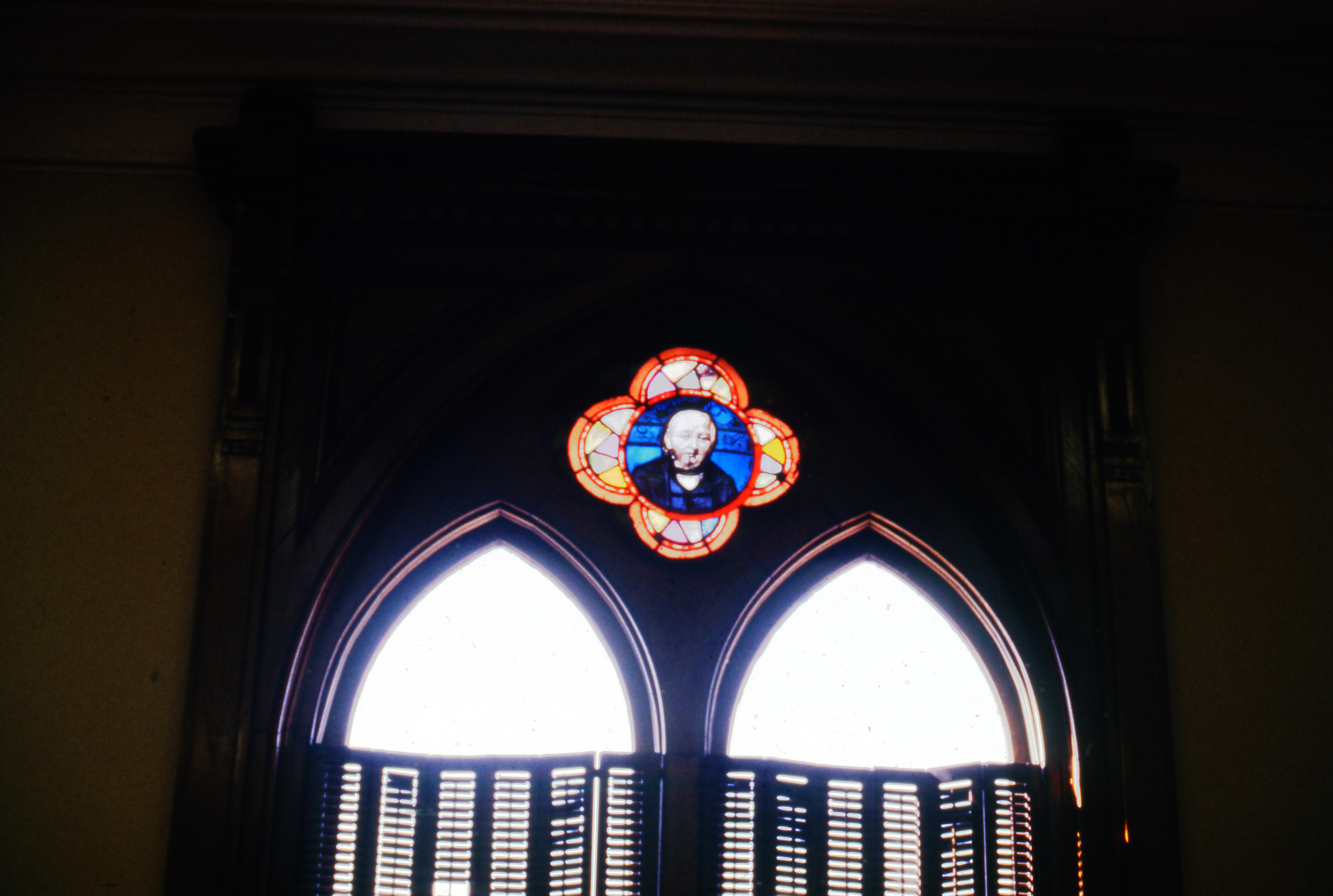 This stained glass window, original to the building, depicts Willard Carpenter. There are similar windows in the building, depicting Shakespeare and Homer. Located at 21 First Ave., Willard Library was a gift to the city by prominent businessman Willard Carpenter. The Gothic revival style building was begun in 1876, but construction ceased in 1877 due to an economic downturn and did not resume again until 1882. The library opened in 1885. Carpenter did not live to see its completion, dying in 1883. Although it is not part of the Evansville Vanderburgh Public Library system, Willard Library is Indiana's oldest public library.