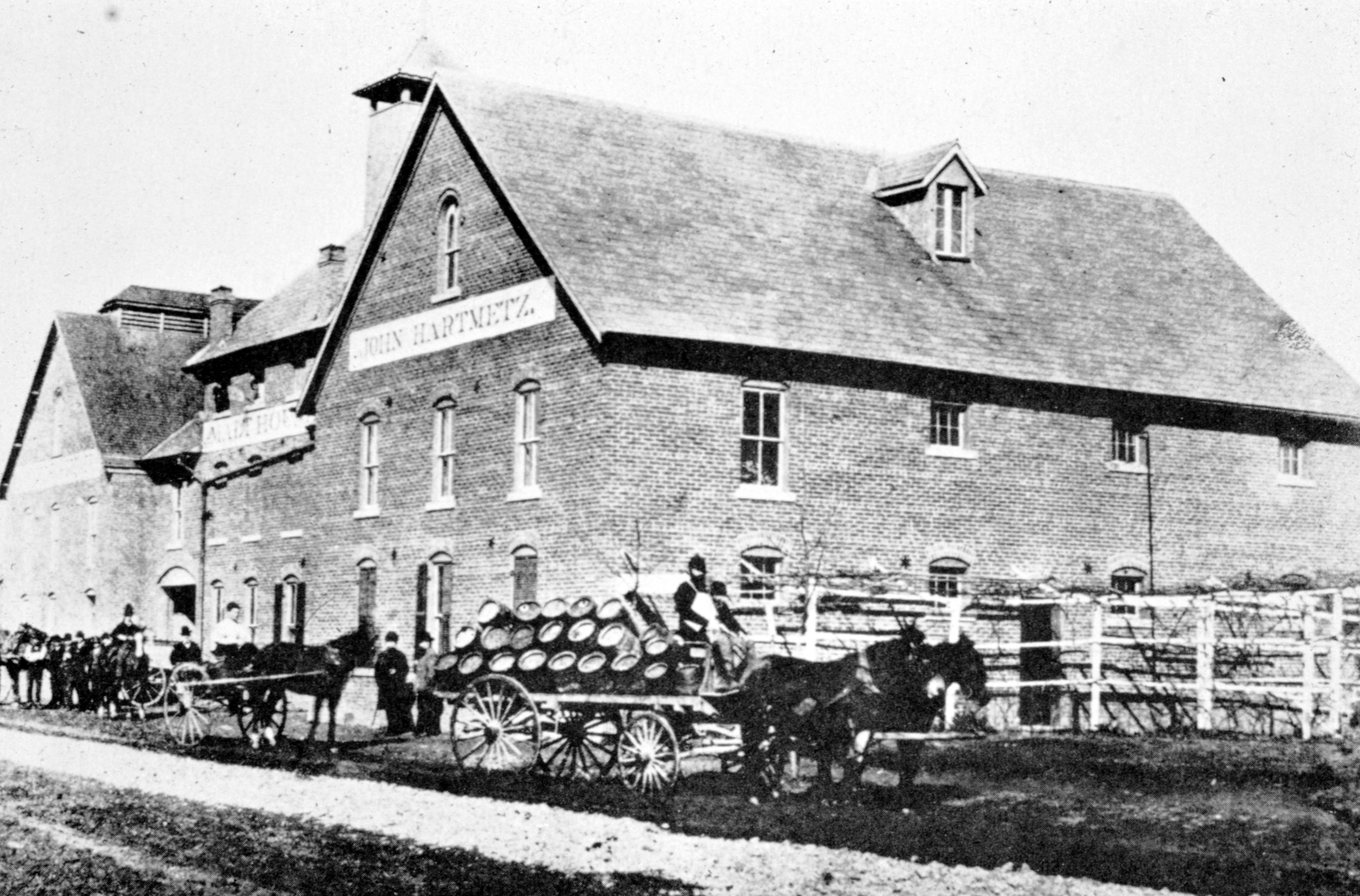 John Hartmetz Brewery, circa 1890, with horses and wagons loaded with kegs outside. This was located on New Harmony Rd. (Harmony Way) and was built in 1863 when it opened as the Henry Schnieder brewery. Schneider suffered business losses, and Hartmetz purchased it at a sheriff's auction in 1877. Hartmetz, ""Evansville Brewery and Fulton Ave Brewery merged to form the Evansville Brewing Association in 1893 in an effort to protect small breweries. This association was reportedly the result of a price war between the larger F.W. Cook Brewery and the non-affiliated breweries in town. The main office went to the Fulton Avenue Brewery [around 1910] and the others were eventually closed."" (http://historicevansville.com/site.php?id=hartmetzbrewery) This building was razed sometime around 1940.