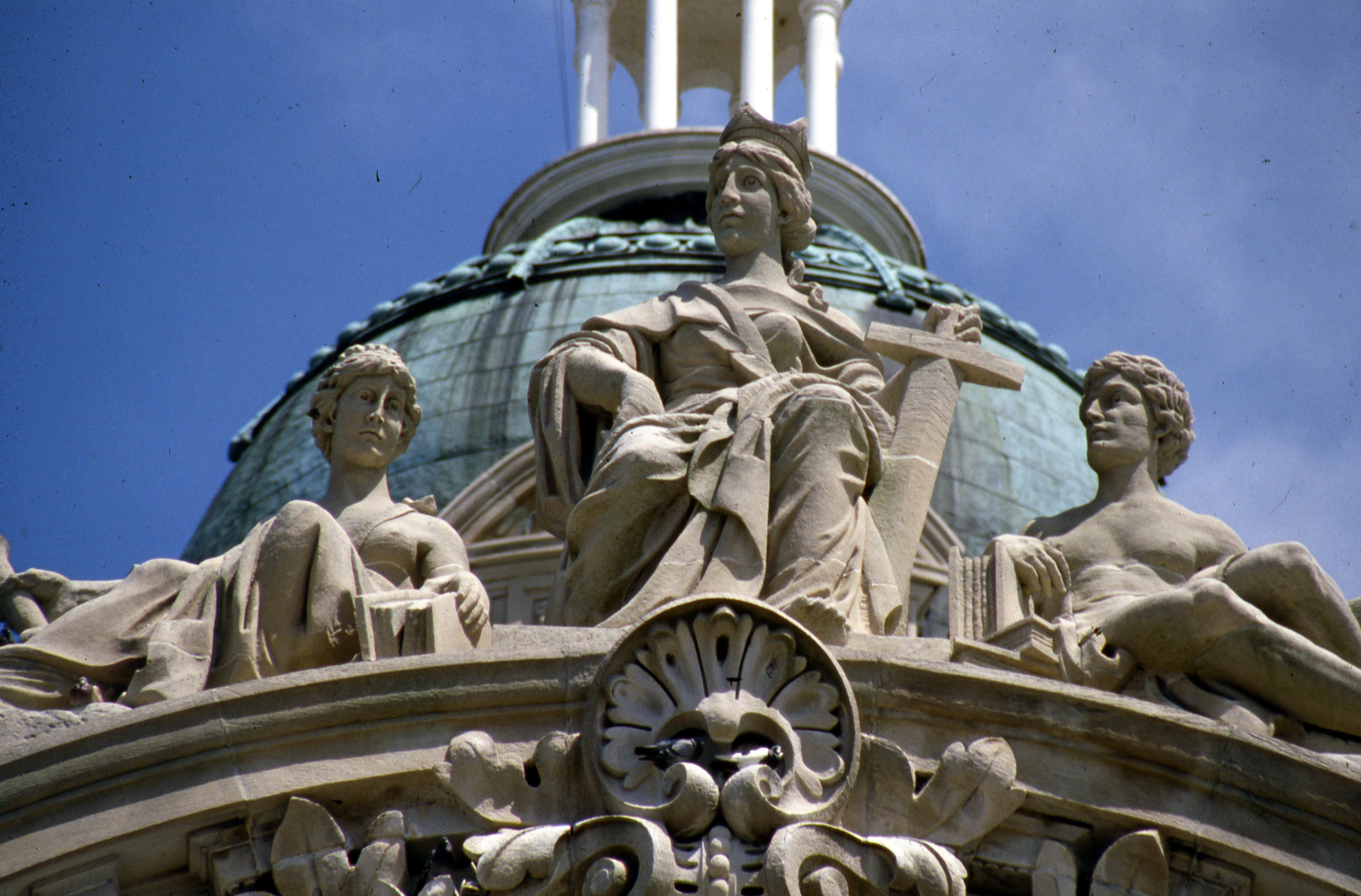 ""High above the Fourth Street entryway to the Old Courthouse sits a grouping of three statues thought to represent the quest for knowledge and truth. [This is a close-up of what is seen in MSS 184-0177.] The central figure wears a crown and holds a crusader's sword in her left hand while decidedly posturing her right hand on her leg. To her left is the only male statue on the building; he rests his right arm on a stack of books and holds in his left hand a tablet. To the right of the central figure is a statue who holds a torch in her right hand and rests her left arm also on a stack of books."" (http://evansville.in.gov/Index.aspx?Page=635) The courthouse sits on ground that was once the turnaround for the Wabash and Erie Canal.