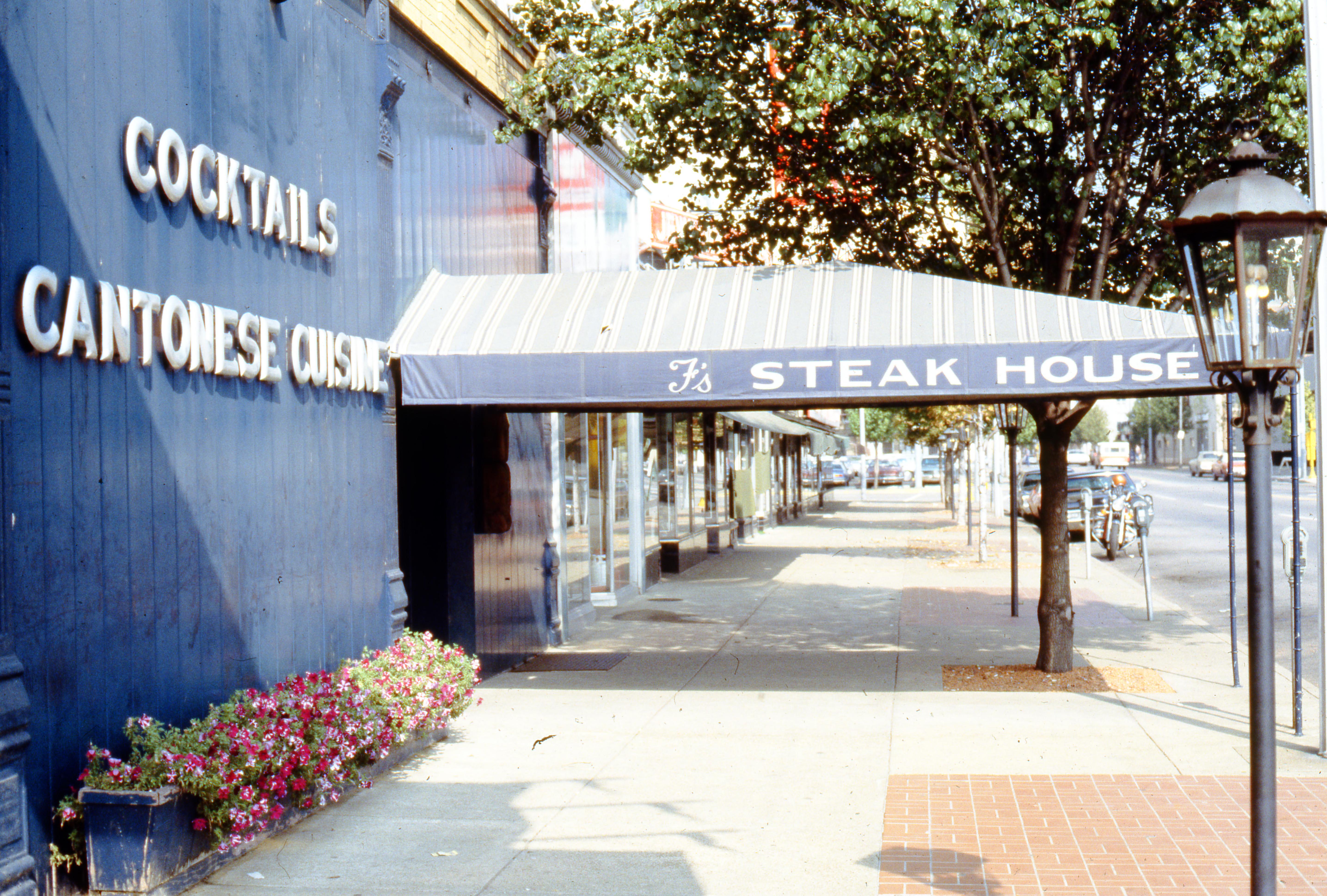 F's Steak House Inc. at 125 SE 4th St. F's Steak House operated from this location for more than 40 years until it closed in 1993. It was the first place in Evansville where you could order Chinese food, and pre-dated the first ""official"" Chinese restaurant by some 20 years. This building still exists (without the elaborate awning) and a Korean restaurant operates there today.