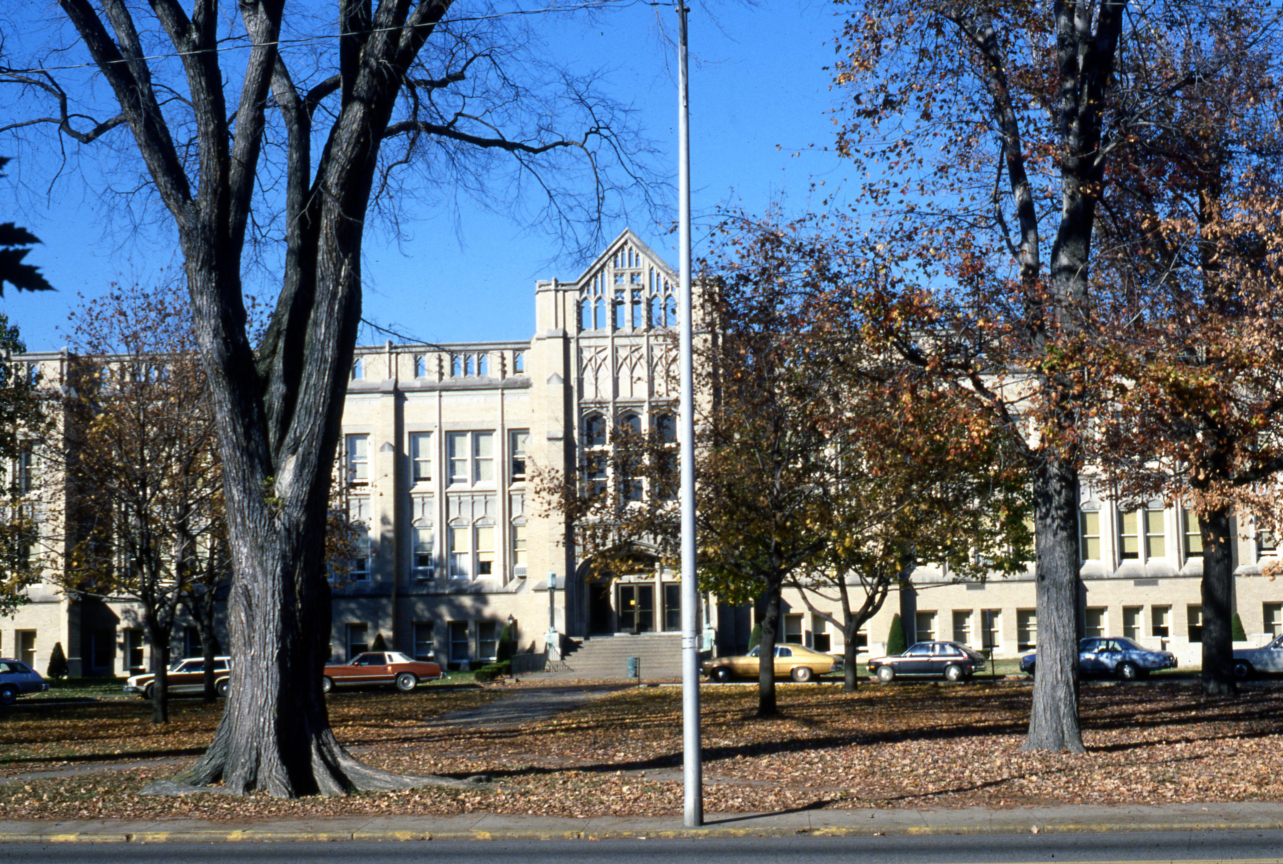 Reitz Memorial High School at 1500 Lincoln Ave. Francis Joseph Reitz, a local businessman, purchased the land for the school in 1922, and it opened in January 1925. Boys were taught by the Brothers of The Holy Cross and the girls by the Sisters of Providence. Major additions were begun in 1967 and again in 1998. Interestingly, Reitz also raised funds for and had a public high school named in his honor in 1918. The school shown here is generally referred to as Memorial, and the public school is callled Reitz.