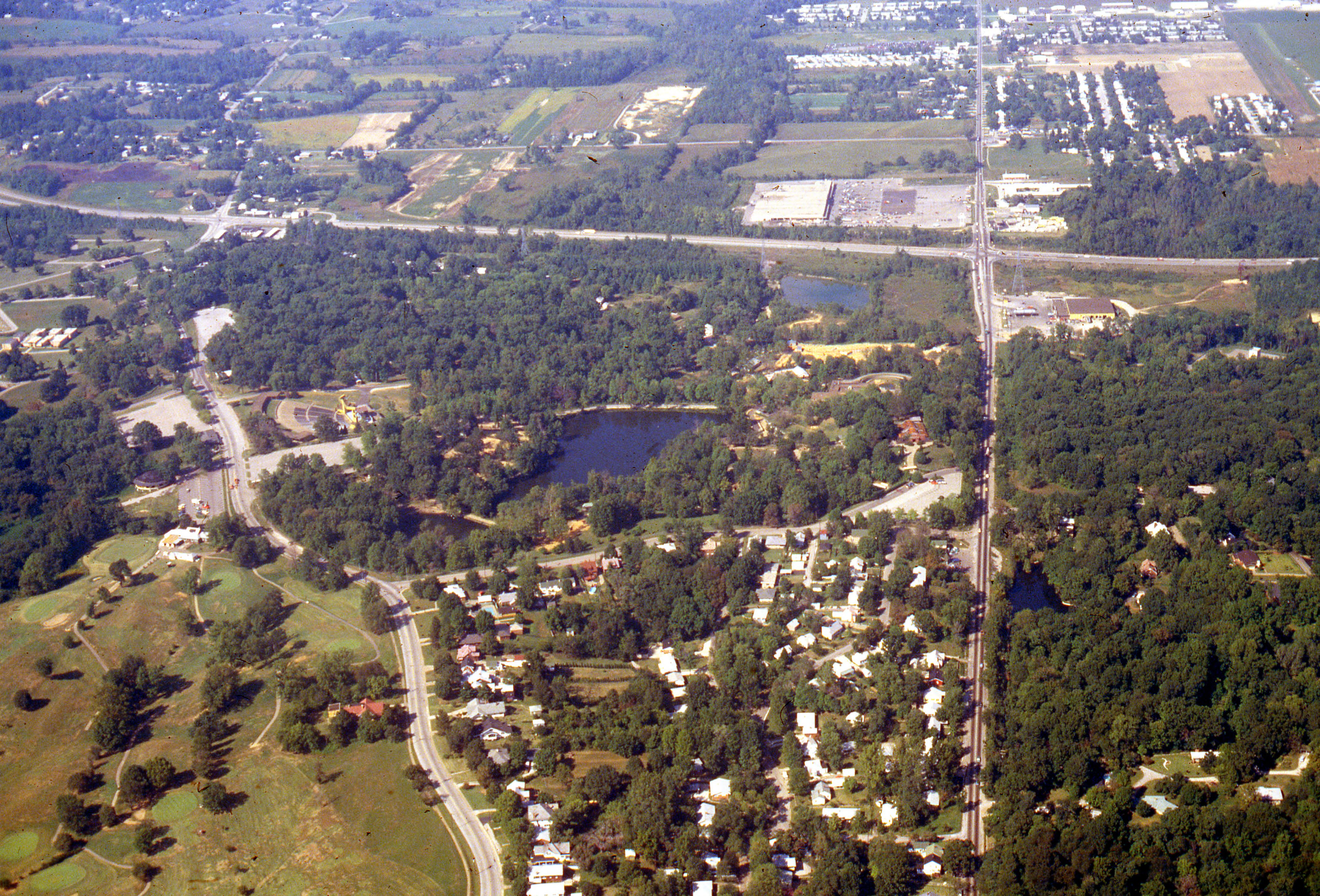 In terms of orientation, the main north/south street seen here is N. St. Joseph Ave., and the intersecting road is Diamond Ave. The curvy road in the foreground is Mesker Park Dr. The lake seen in the middle is part of Mesker Park Zoo and if you zoom in, just beyond that along Mesker Park Dr. is Mesker Amphitheatre at 1551 Mesker Park Dr. In 1900, George Mesker, owner of Mesker Iron Co., donated land and money for Mesker Park. With more funding and land, a zoo opened in the park in 1928. Mesker made an additional donation in 1936 to improve the park and to support music programs. Delayed by WWII, the amphitheatre finally opened in 1951/1952. For years it was vastly popular, hosting well known musical groups and a theatre program. Wikipedia says it has 8500 seats, chairback and lawn. No longer heavily used, it has fallen into disrepair and was closed in 2012. Its future is uncertain. The zoo is at 1545 Mesker Park Dr., and when opened, was one of the first to use a moat system. It has been expanded--the area wooded area in front of the lake (known as Lake Victoria) is now a parking lot and new entrance. At the time of this photograph, the entrance would have been on Bement Ave., the short street off to the right of Mesker Park Dr.