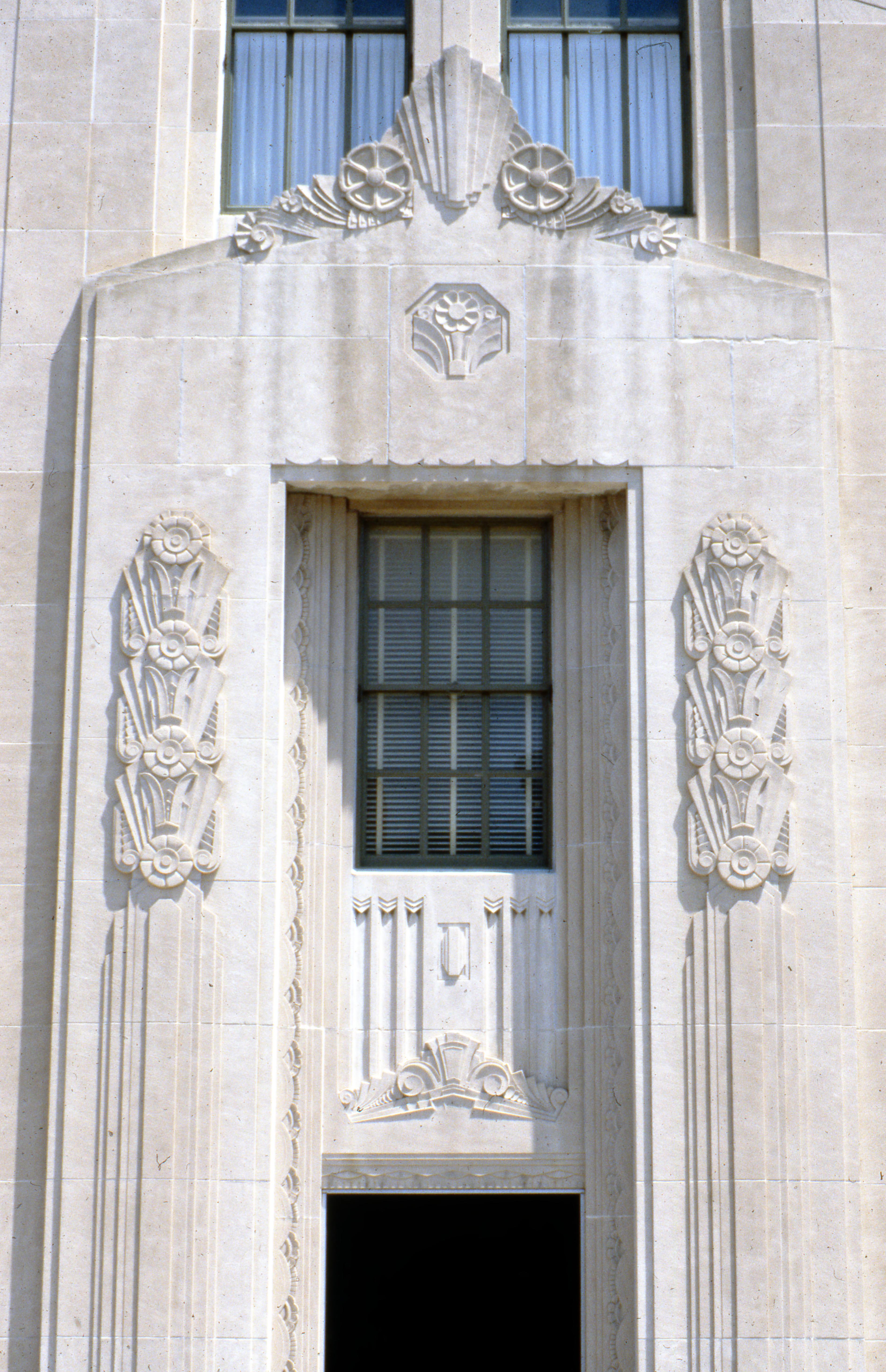 This is the ornamentation is over the door of the Indiana Bell Building at 129-133 NW 5th St. The building dates to 1929, and remains today. SEE ALSO MSS 184-0160.