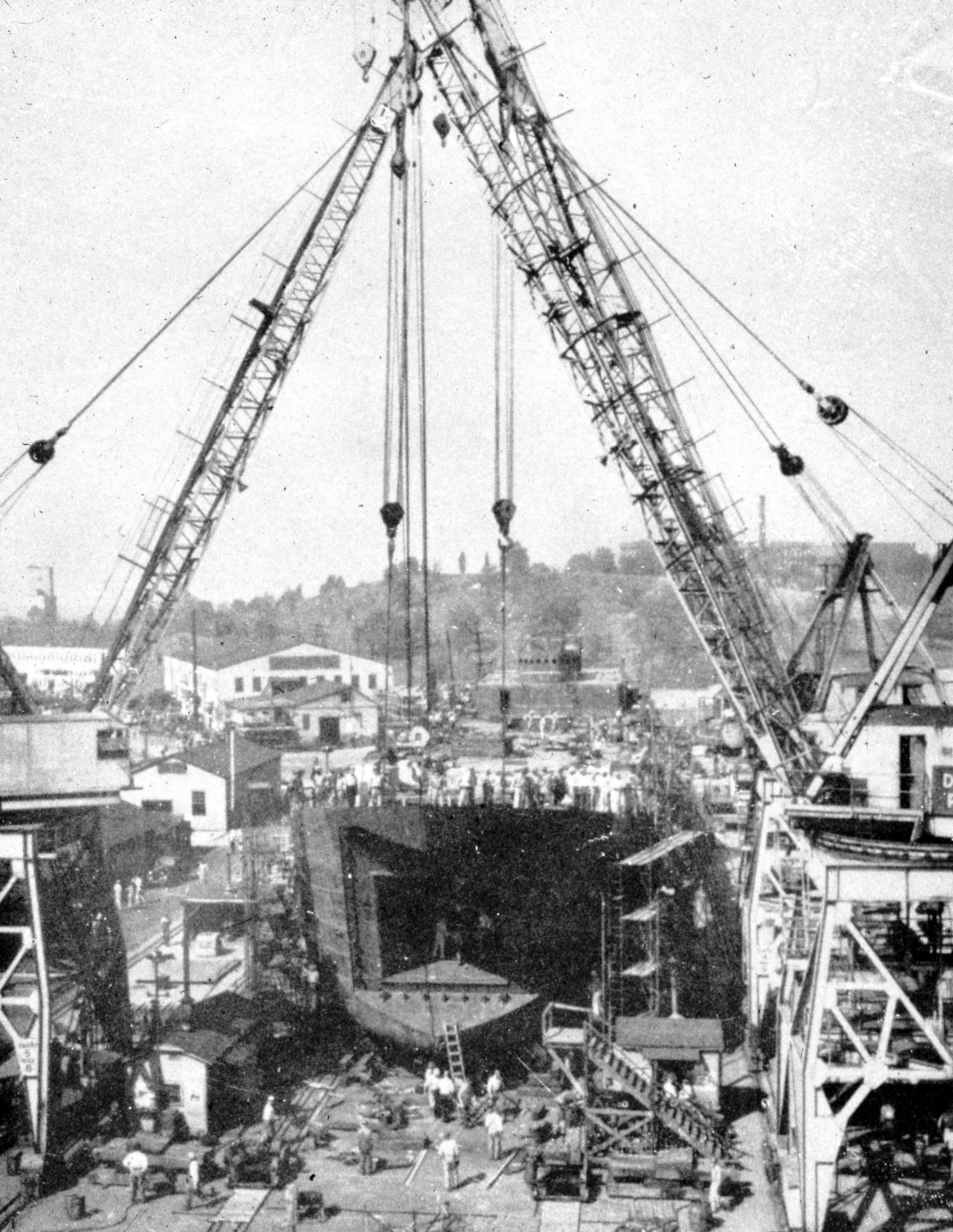 LST under construction, with Reitz Hill in the background. In 1942 some 45 acres of riverfront property (approximately where Mead Johnson is now) was made into Evansville Shipyard, with the Missouri Valley Bridge and Iron Co. contracted to build LSTs (Landing Ship Tank). The first LST was launched even before the yard was completed. At its height, over 19,00 were employed here, and Evansville made more LSTs than any other shipyard in the country. In its only three years of operation, the Evansville Shipyard built 24 ships, 167 LSTs, and 35 other war crafts. The last ship was launched December 12, 1945. A fire swept through the plant in January 1946, and today, nothing remains of this operation.