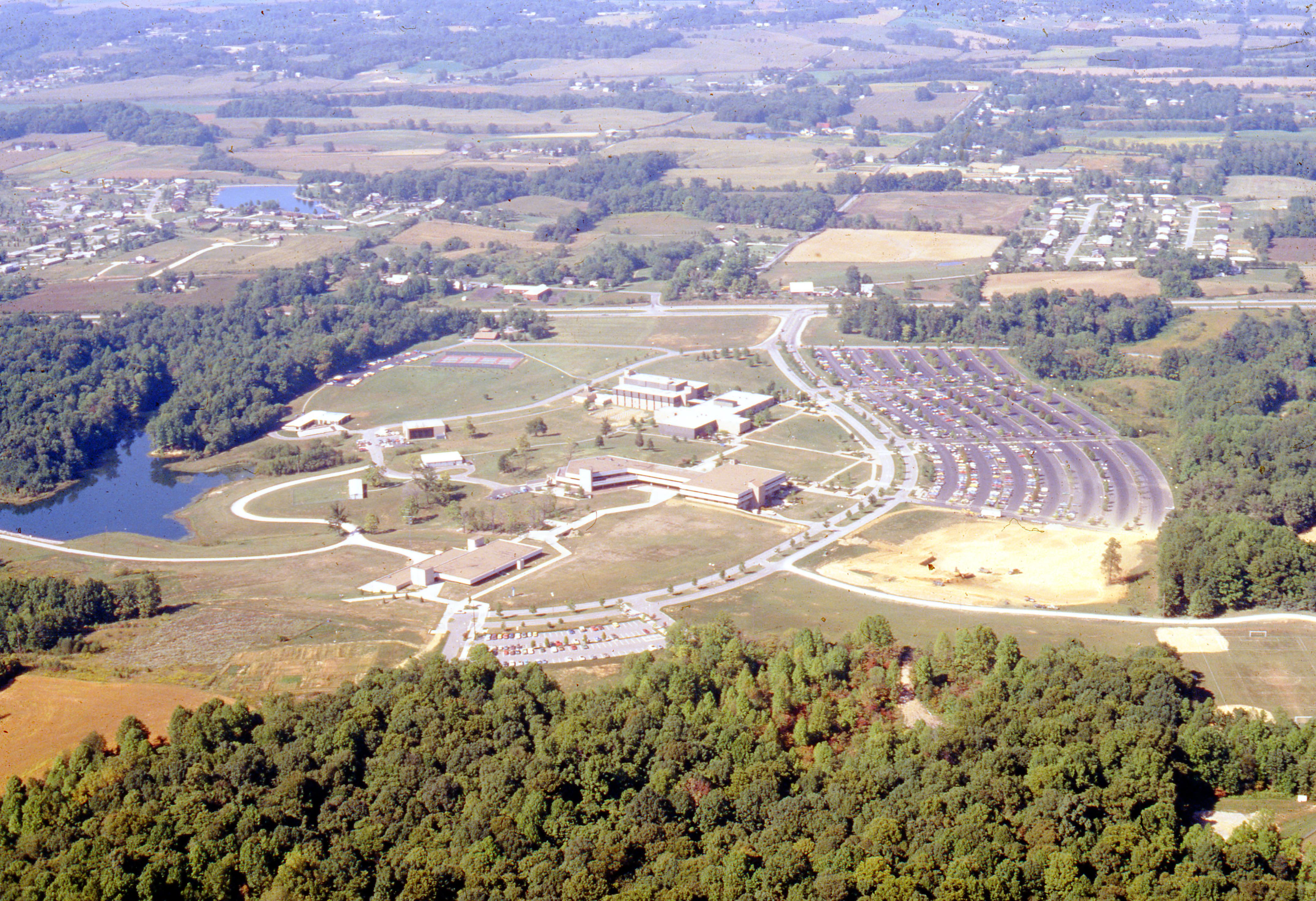 Indiana State University-Evansville (ISUE) at 8600 University Blvd. Established as a branch campus of Indiana State University in 1965, the college moved to the location depicted here, some 1400 acres, in 1969. In 1985 the university was made a separate state university, the University of Southern Indiana (USI). This is an aerial view of campus.