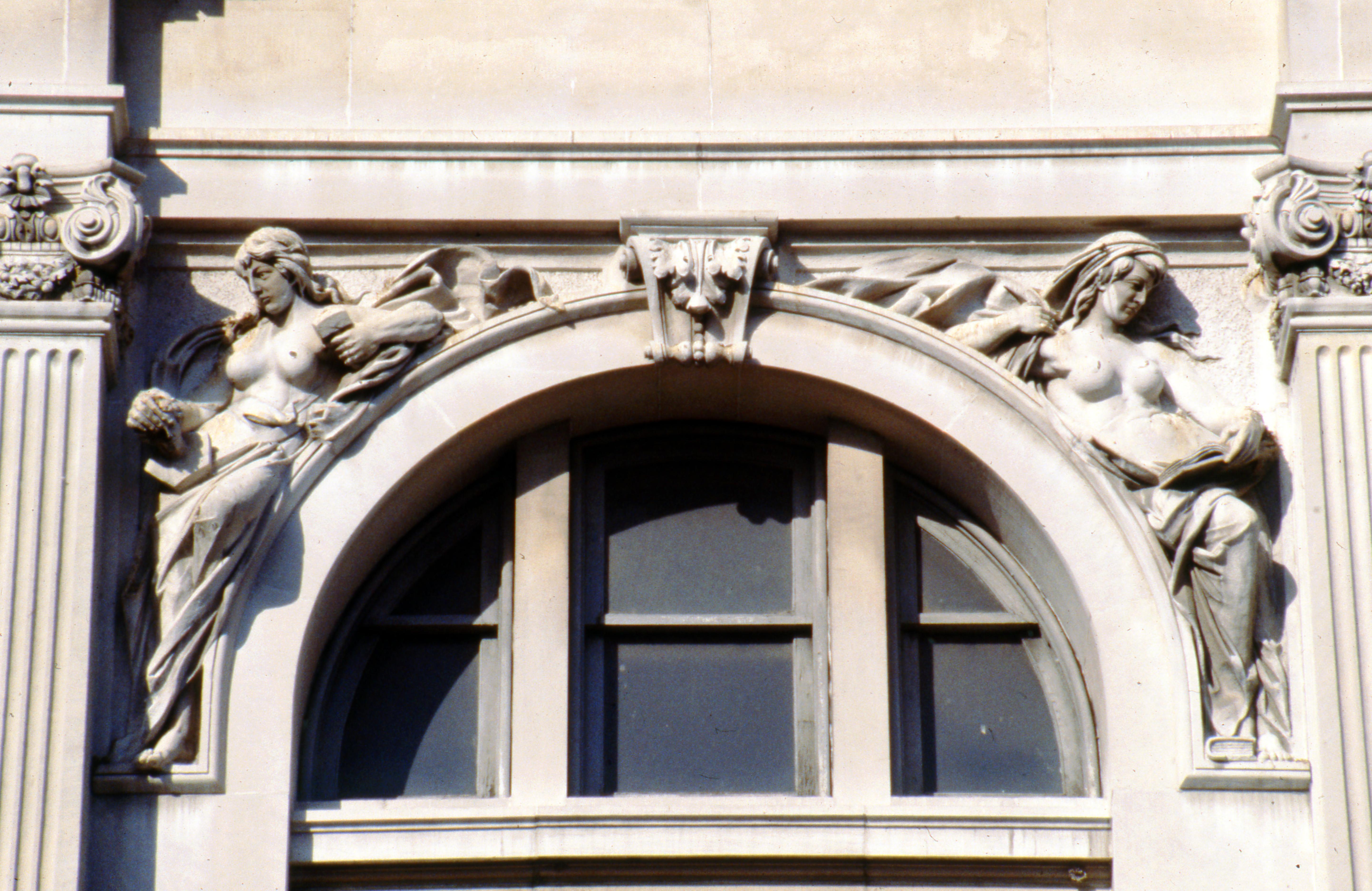 This Vanderburgh County Courthouse at 201 NW 4th St. was completed in 1890. The building still stands, but is now referred to as the old courthouse, as government offices moved into another building in 1969. (It would not have served as a courthouse at the time of this photograph.) The courthouse spans the block between NW 4th St. and NW 5th St., bounded by Vine St. and Court St. ""There are muses above the doorway arches [5th St. side] The one on the left holds a mallet in her left hand and a bust in her right hand, presiding over sculpture. The one on the right holds a book in her left hand, presiding over literature."" (http://evansville.in.gov/Index.aspx?Page=635) The courthouse sits on ground that was once the turnaround for the Wabash and Erie Canal.