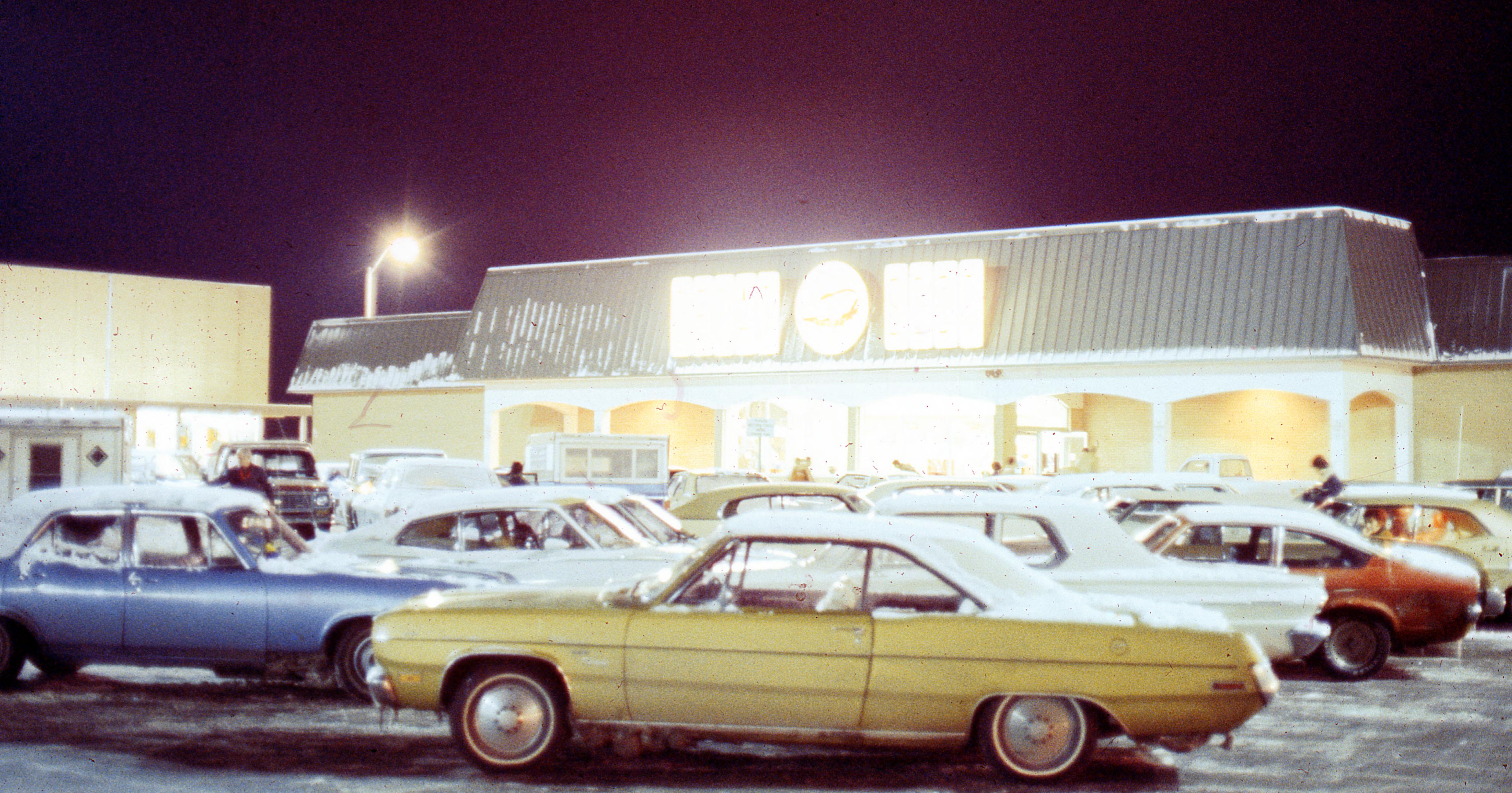Great Scot supermarket at night, at the corner of Main St. and Franklin St.--the official street address was 31 W. Illinois St. According to the 2015 Google maps view, there was still a grocery store at this location, although not Great Scot.