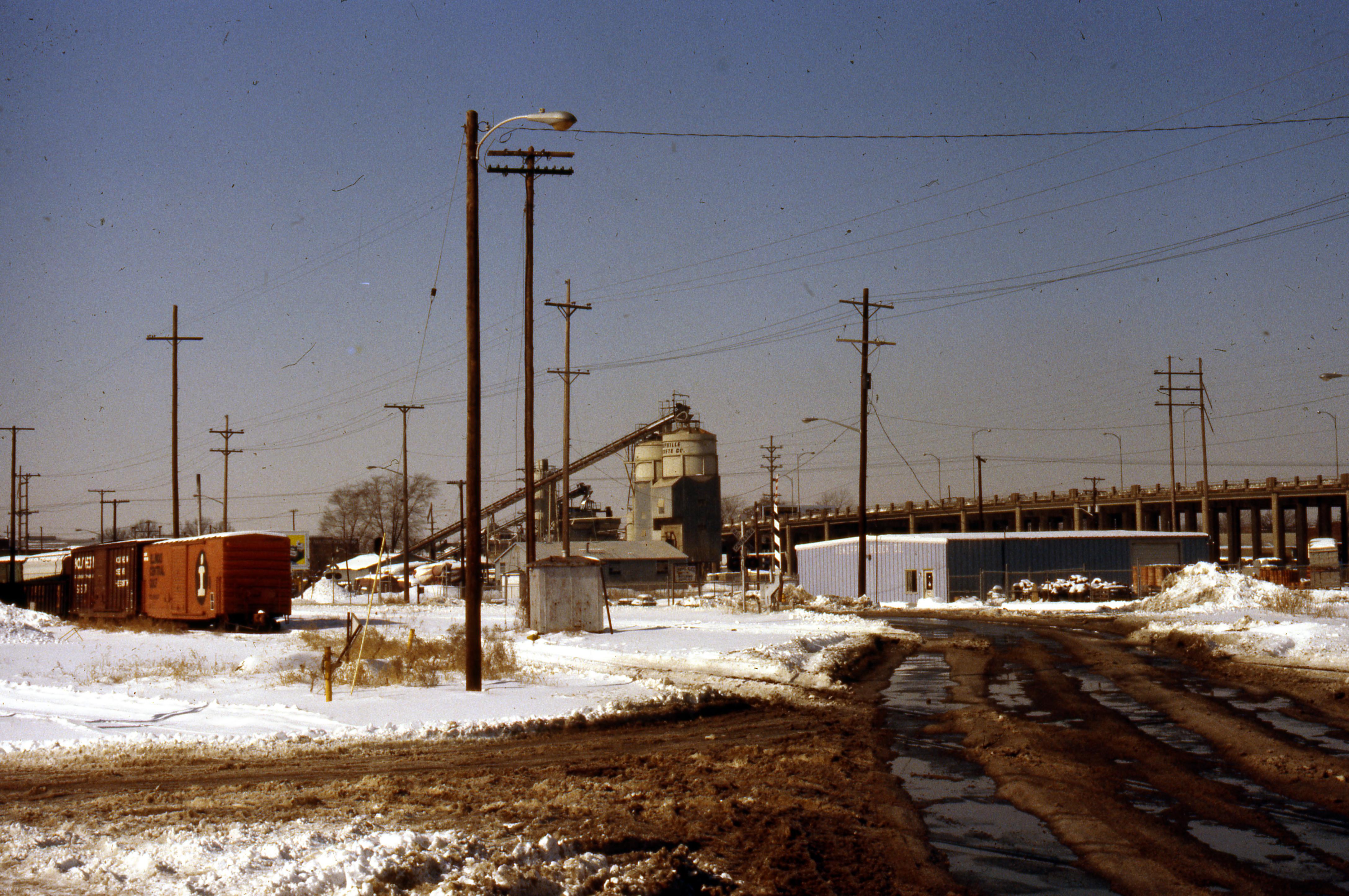 Tekoppel Block Co. Inc. at 1701 W. Ohio St. (low blue building). The towers with the shute are Evansville Concrete Co., Inc. at 1816 Pennsylvania St. Tekoppel Block is still in business in this same building. There's a different concrete company occuping the 1816 address, and the silos seen here have changed. That street is currently named the W. Lloyd Expressway.