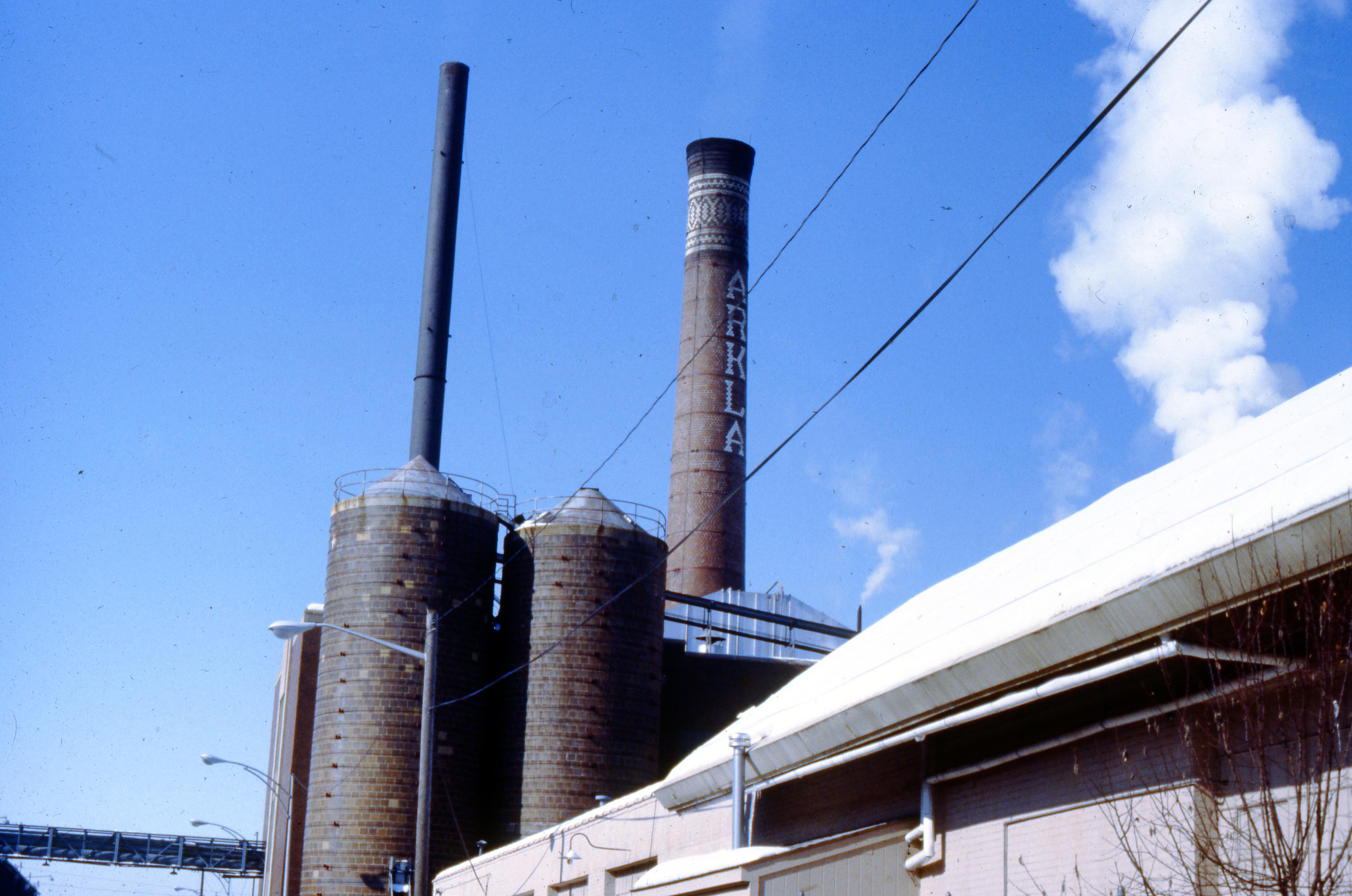 Arkla Air Conditioning Corporation at 810 E. Franklin St., with its smokestack. Arkla Air Conditioning was a 1957 subsidiary of a natural gas company; the name is a combination of Arkansas and Louisiana. This facility is no longer in existence.
