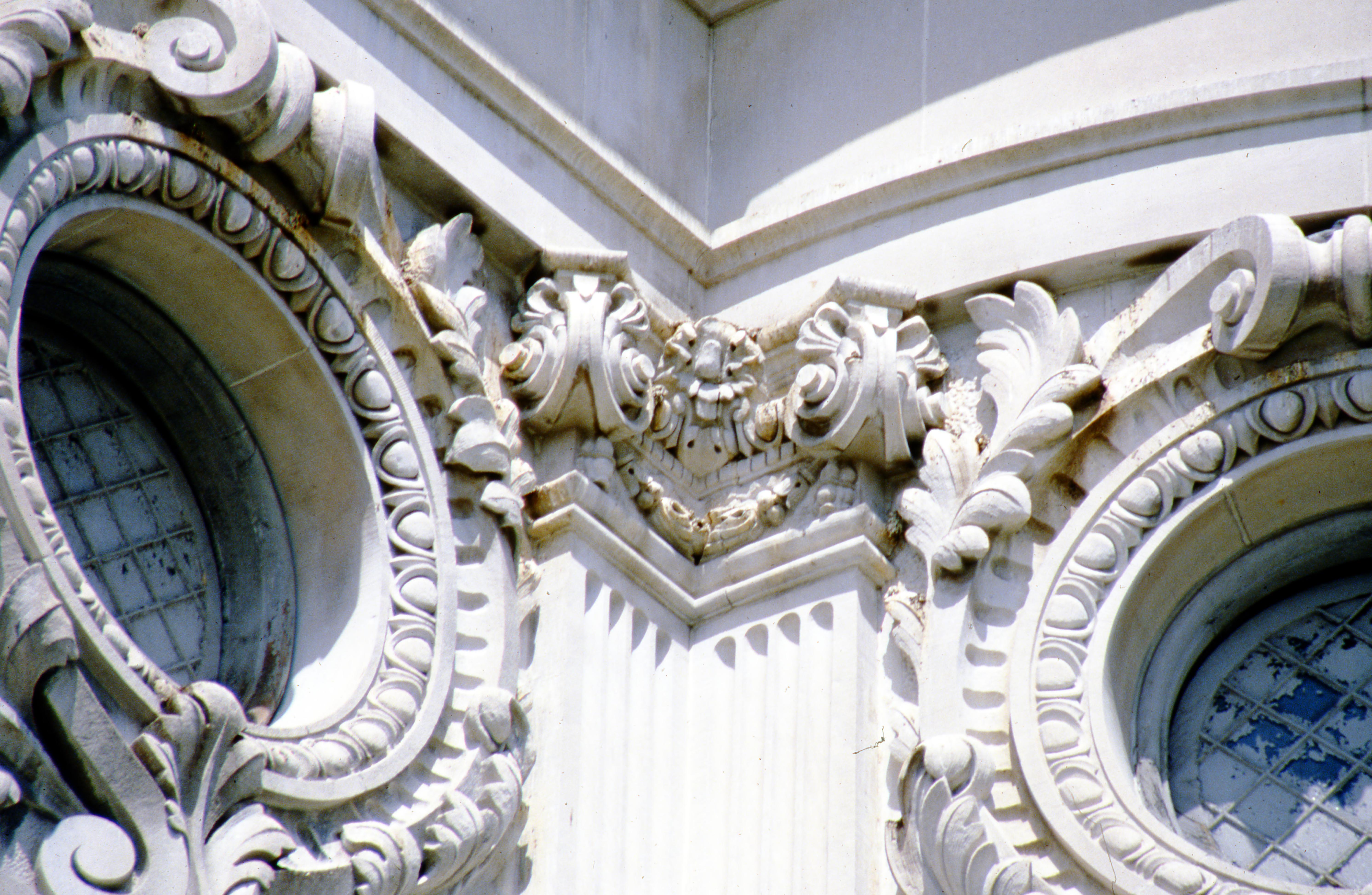 This Vanderburgh County Courthouse at 201 NW 4th St. was completed in 1890. The building still stands, but is now referred to as the old courthouse, as government offices moved into another building in 1969. (It would not have served as a courthouse at the time of this photograph.) The courthouse spans the block between NW 4th St. and NW 5th St., bounded by Vine St. and Court St. This is a close up of the round windows seen in MSS 184-0175. These round windows appear below the domes on all four corners of the building and additionally on both the 4th St. and 5th St. sides. Because of the angle shown here, this is believed to be on one of the four corners. The courthouse sits on ground that was once the turnaround for the Wabash and Erie Canal.