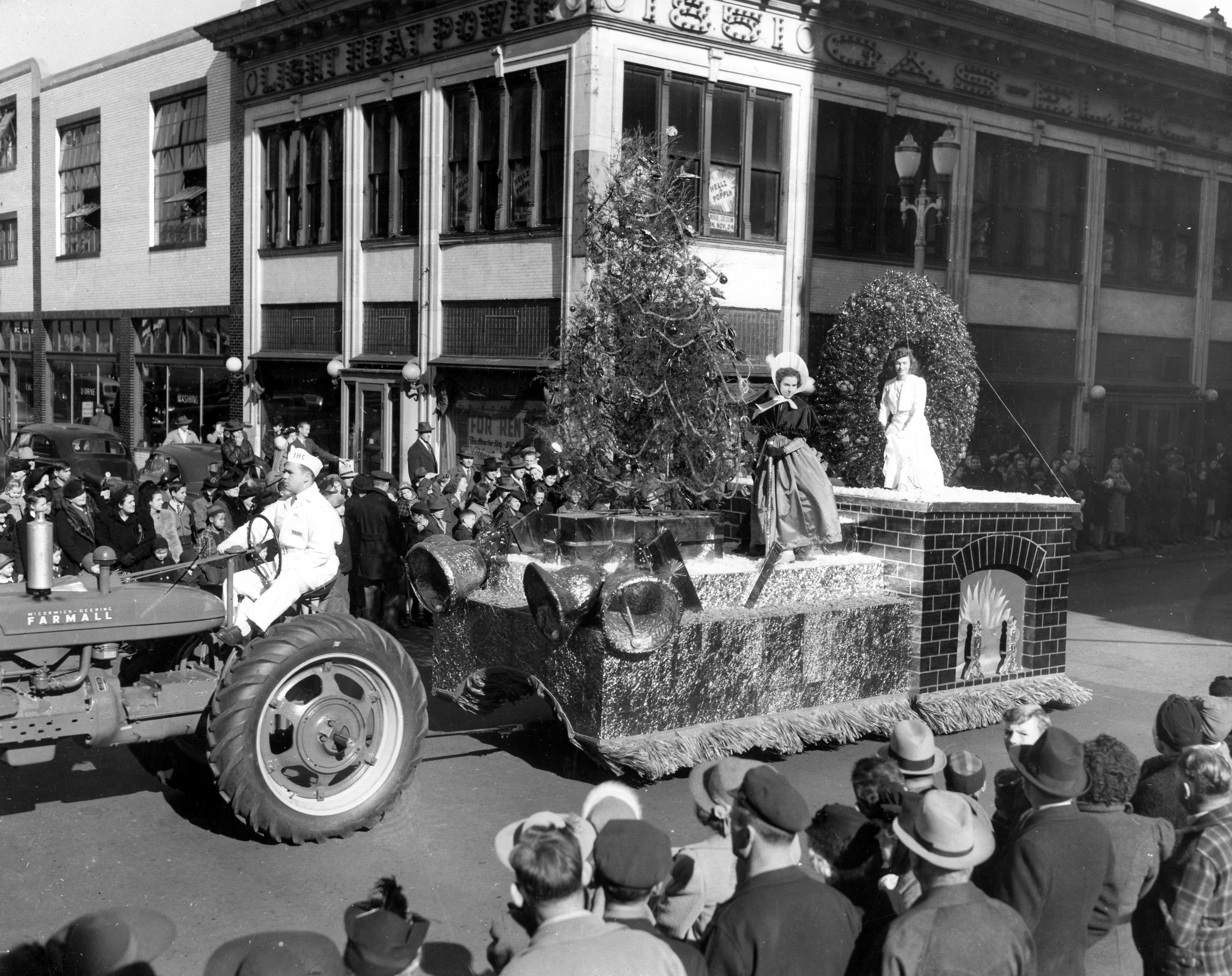 Christmas parade on Sycamore St., at the intersection with NW 2nd St. The Skora building seen here, home of SIGECO, was at 101-103 NW 2nd St.