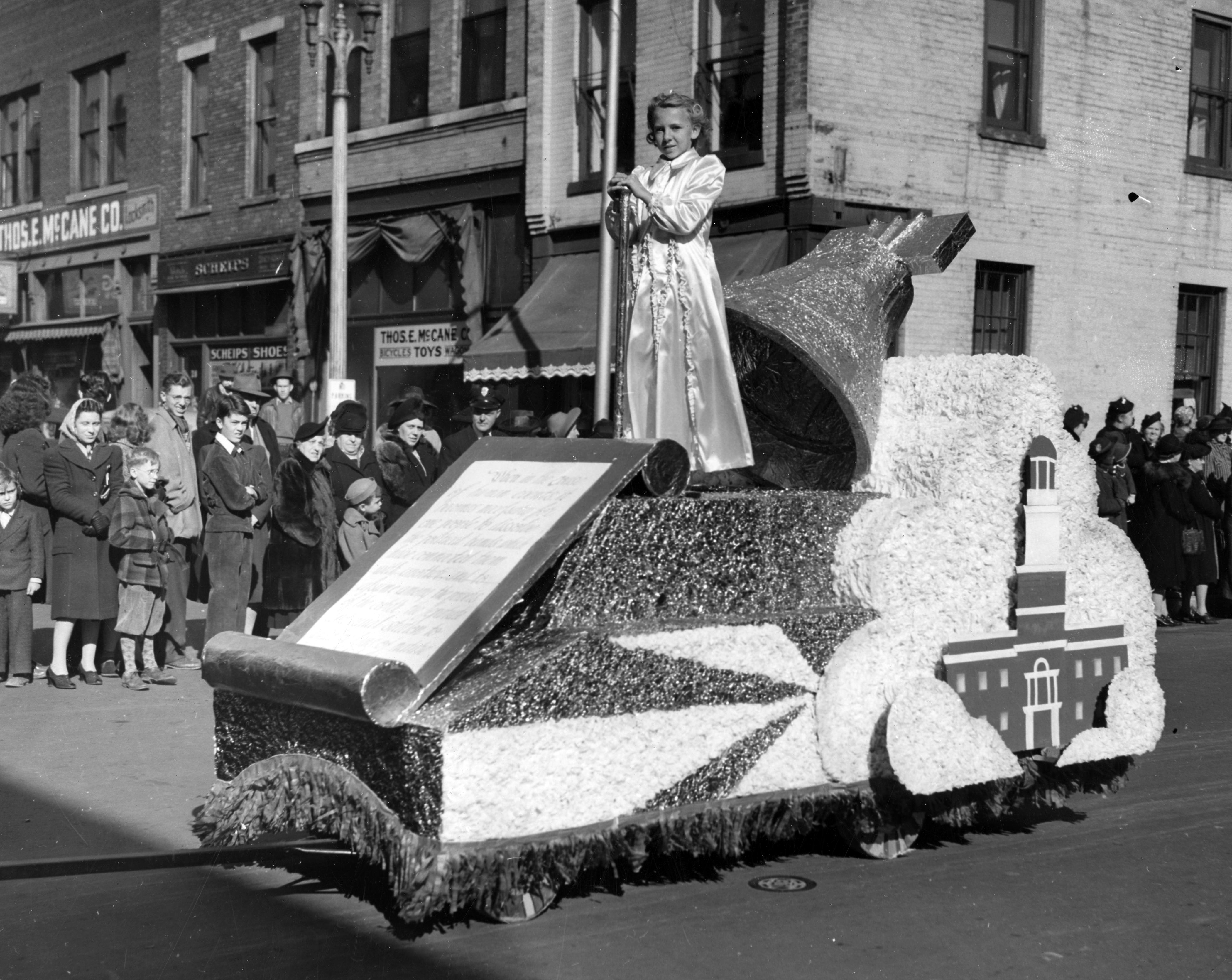 Christmas parade on 3rd St., crossing Main St. The Scheips Shoe store seen just beyond middle left was at 301 Main St.