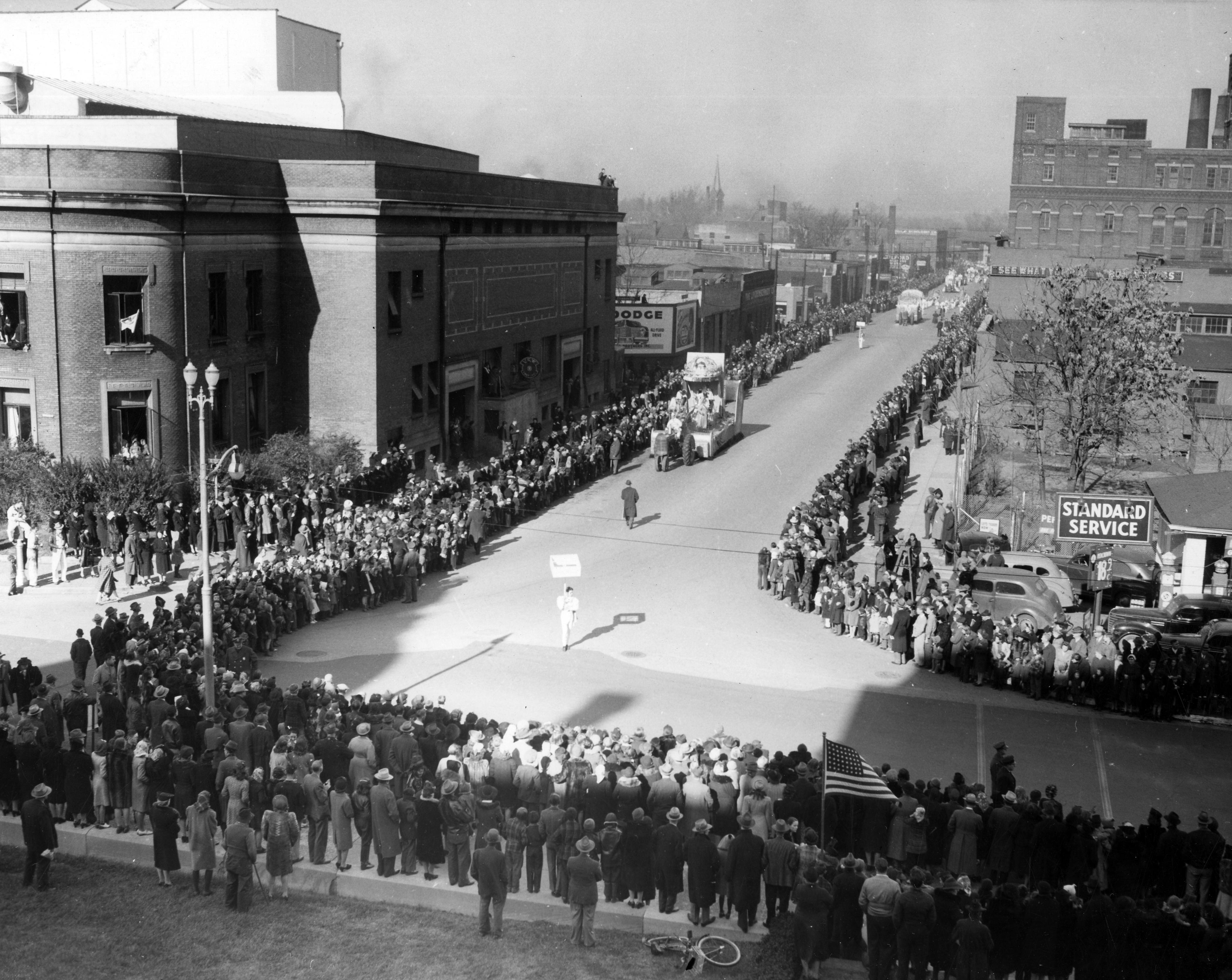 Crowd awaiting Christmas parade near the Soldiers and Sailors Memorial Coliseum at 350 Court St. This view looks up what is now Coliseum Ct. but was part of 4th Street. Osbourne Stand Service station is on the right.
