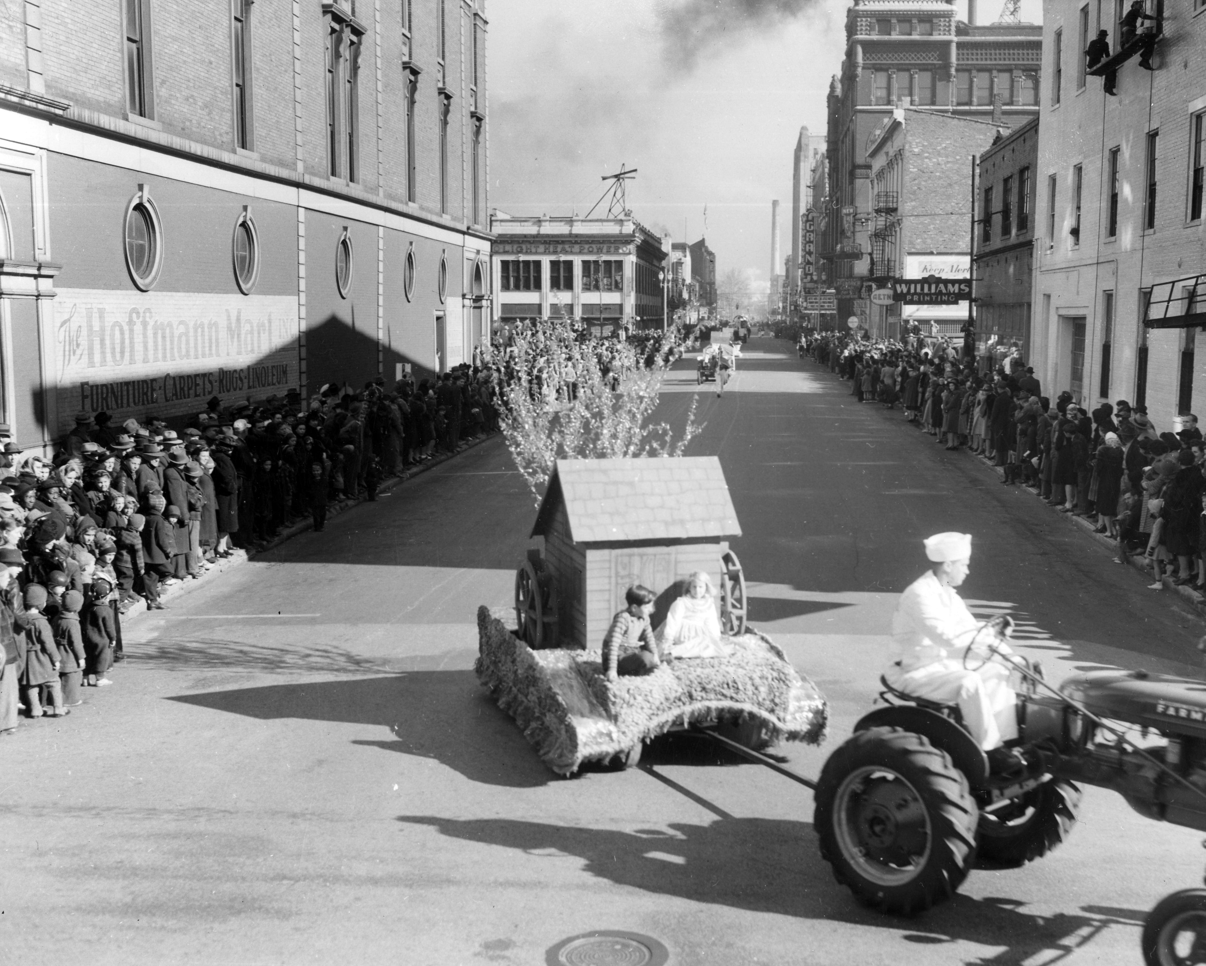 Christmas parade on Sycamore St., past the intersection with NW 2nd St. The Skora building seen here (left background), home of SIGECO, was at 101-103 NW 2nd St.