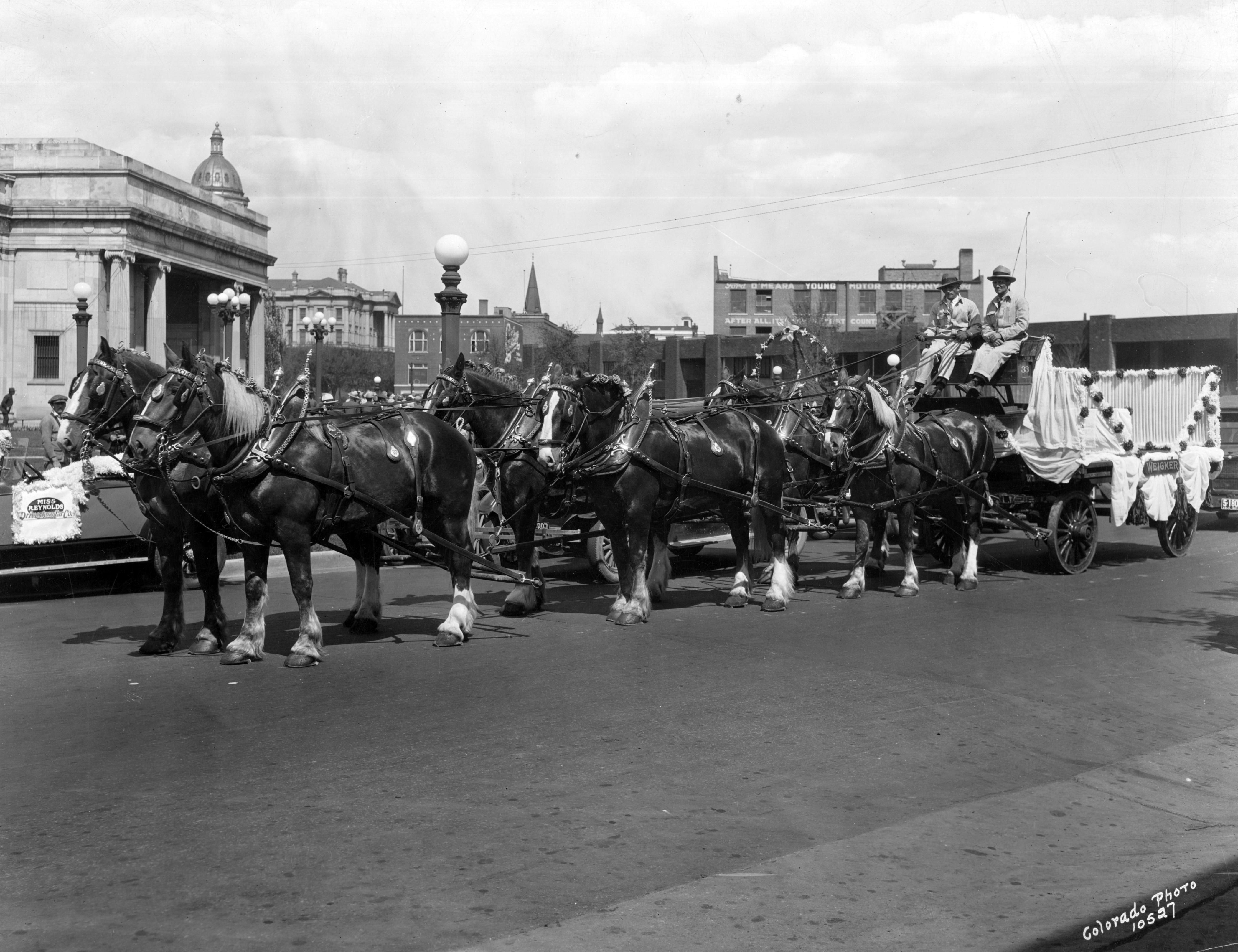 Wagon with the name Weicker on it, drawn by a team of 6 horses. This location is in front of the Greek Theater and Colonnade of Civic Benefactors, located on the south end of Civic Center Park. It was designed by architects Willis A. Marean and Albert J. Norton and was constructed in 1919. (https://www.masonryofdenver.com/2014/09/civic-center-park-greek-theater-voorhies-memorial/) Weicker Transfer and Storage Company was on Bannock Street in the Civic Center neighborhood of Denver. According to a 2013 Denver Post article, the O'Meara Ford business had been in Denver since 1913 and was still in business 100 years later.