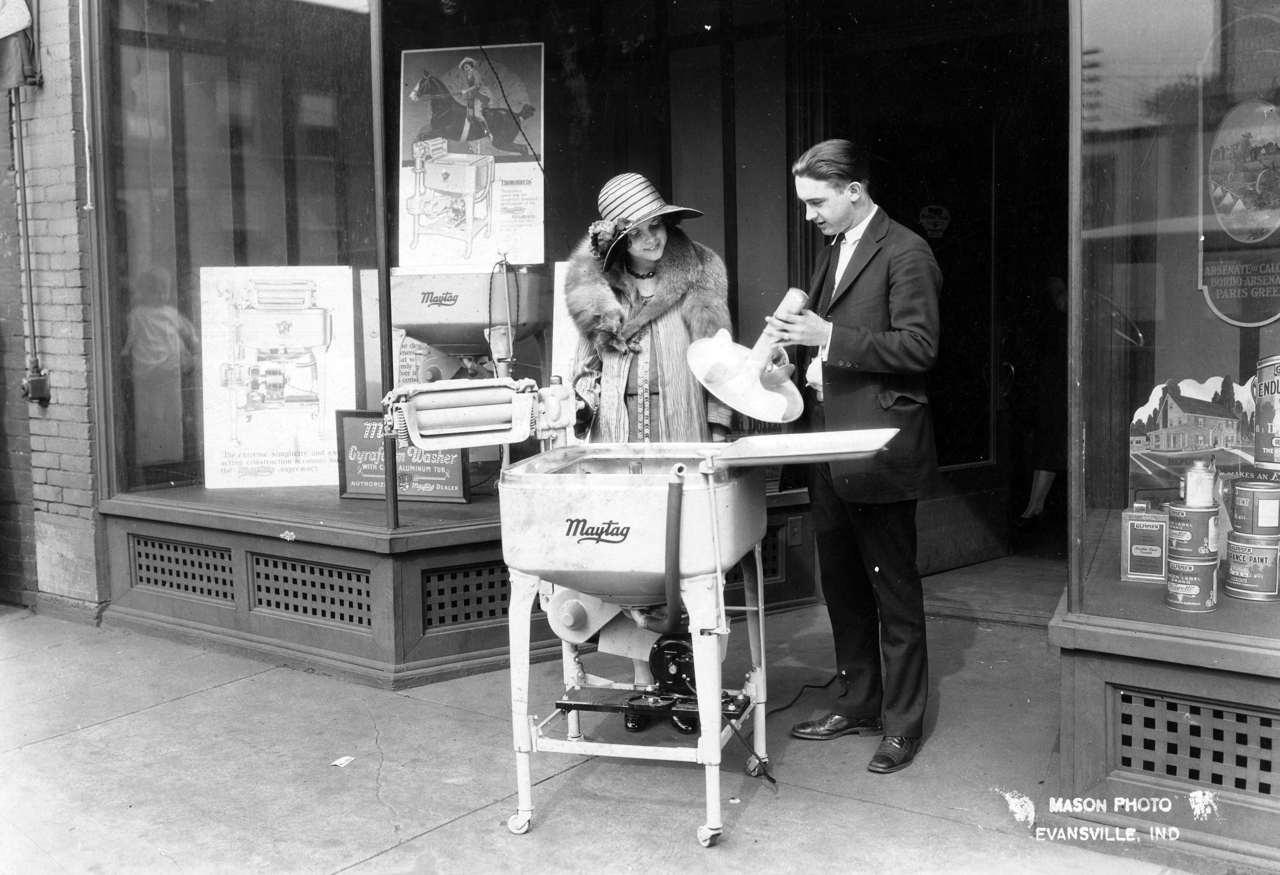 Salesman showing a customer a Gyrafoam Maytag washing machine on the sidewalk just outside the store.