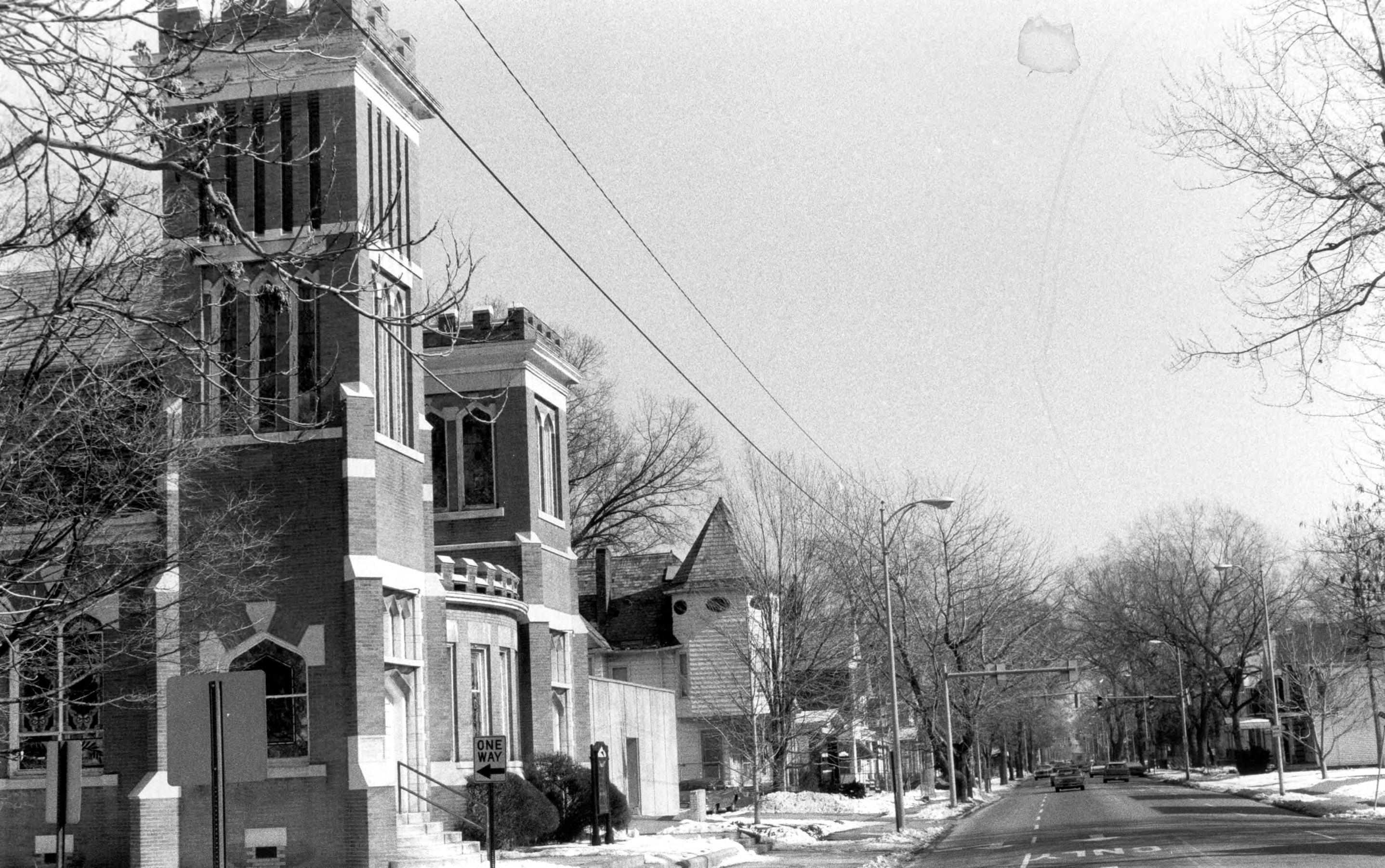 Washington Ave., looking east from SE 6th St. (the One Way street). The building is the Washington Avenue Temple, at 100 Washington Ave., built in 1903. This represents the second home for the B'Nai Israel congregation, which predates this building by at least 50 years. In 1925 the building was destroyed by fire, but rebuilt. In 1980, facing dwindling numbers, this congregation merged with Adath Israel and moved to its facility much further east on Washington Ave. The building seen here was sold to Patchwork Central, a community building organization. In 1983, a fire that started in the bakery completely destroyed the building, with the exception of the tower on the left. This building was razed and Patchwork Central built a small, industrial style building, but kept the tower in tribute and memory. The next building up, with the turret, until very recently housed a food co-op that was affiliated with Patchwork Central. That building, at 116 Washington Ave., was built in 1894 according to the tax assessor's database and is in fair condition.