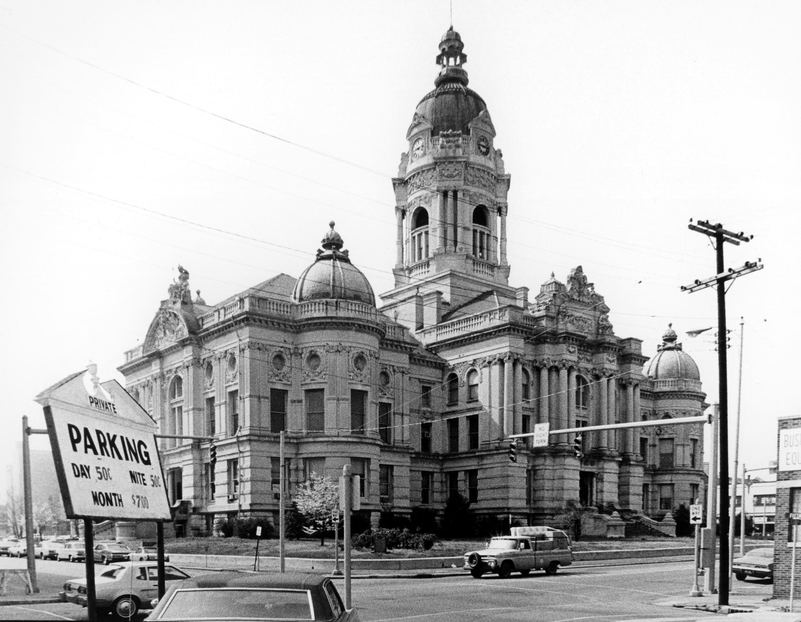 Old Vanderburgh County Courthouse, a Beaux Arts structure was designed by Henry Wolters of Louisville, KY. Construction began in 1888 and was completed by 1890, with offices moving in early in 1891. It occupies the block bounded by 4th, Vine, 5th, and Court streets, an area that was once a turnaround basin for the Wabash and Erie Canal. The building still stands, although it has not served as a courthouse since 1969.