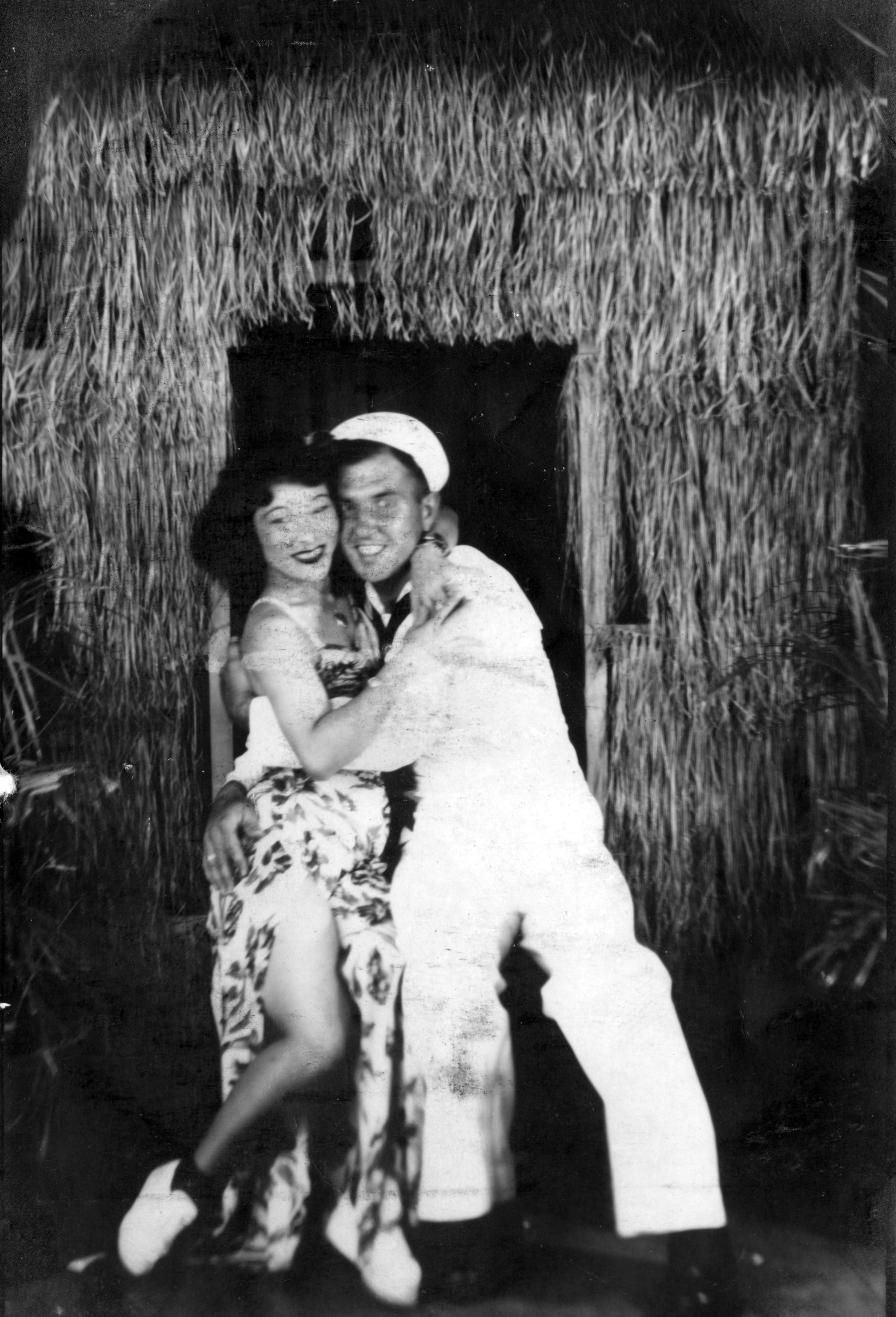 WWII sailor James Roy Paul and an unidentified woman, posing with an image of the tropics.