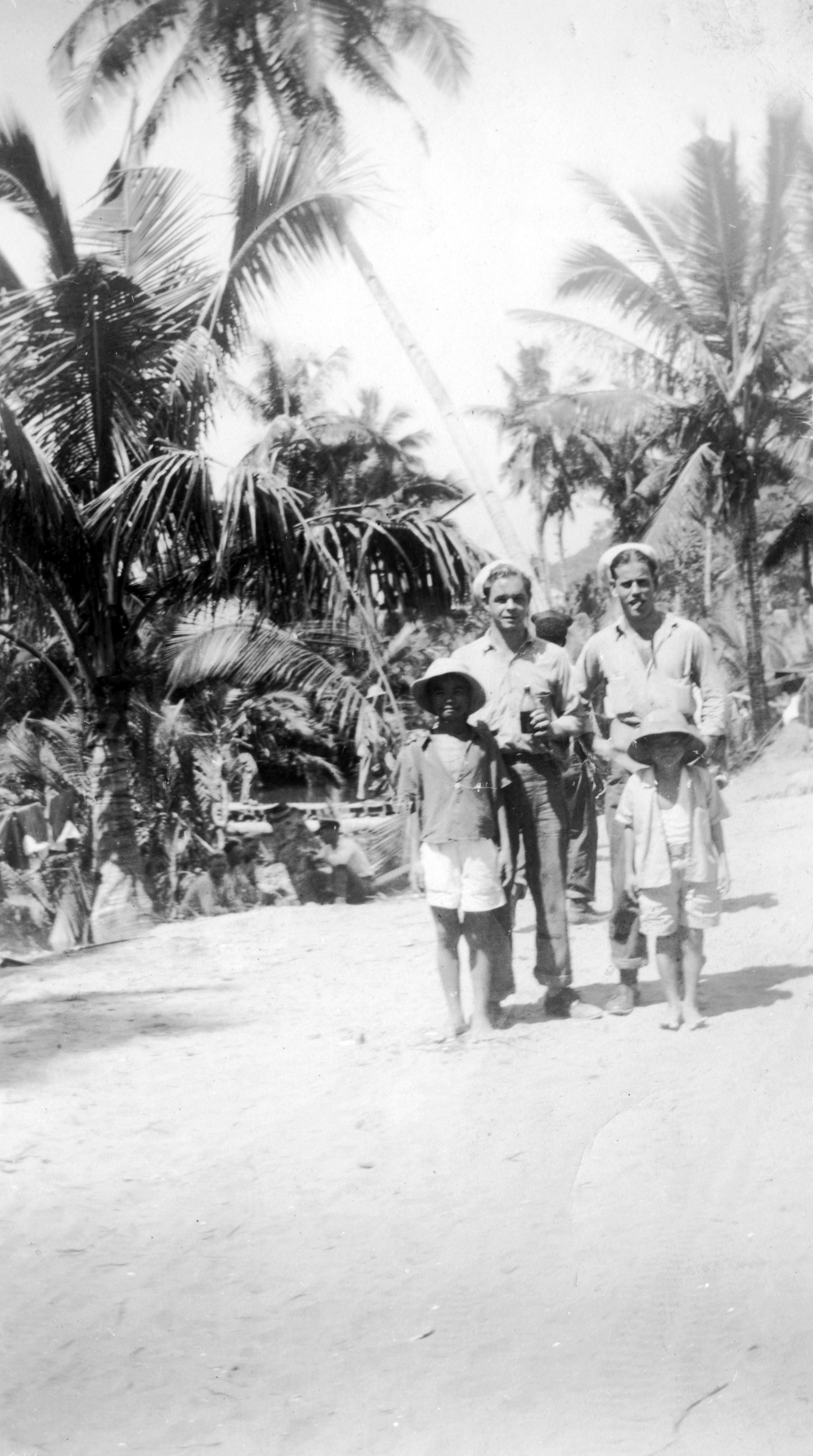 WWII sailors Danny Sumpter (possibly Danny Alfred Sumpter, 1925-1987) of Oregon and Floyd Young on liberty, with two Filipino boys.
