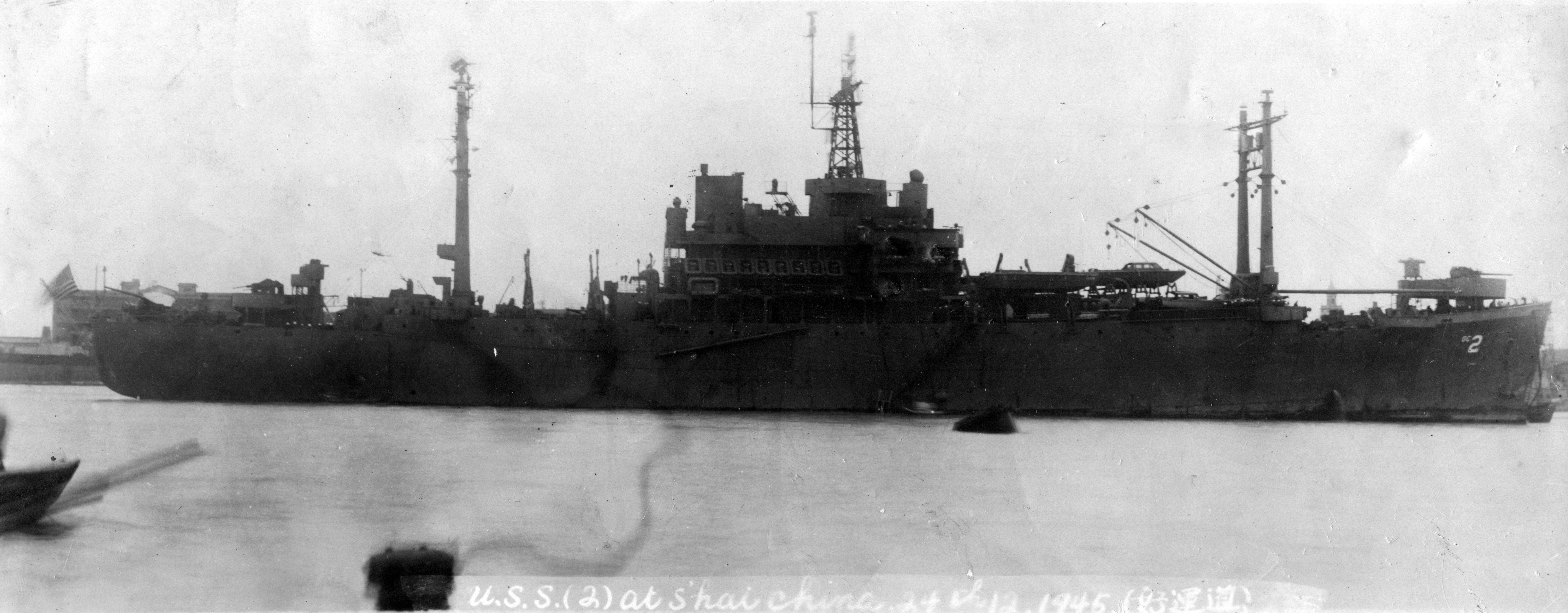 WWII ship, USS (2), possibly the USS Blue Ridge. Blue Ridge AGC-2. Appalachian Class Amphibious Force Command Ship: Laid down, 4 December 1942, as a Maritime Commission type (C2-S-B1) hull, under Maritime Commission contract (MC hull 201) at Federal Shipbuilding and Dry Dock, Kearny, N.J. Launched, 7 March 1943. Transferred to the US Navy, 15 March 1943. Commissioned USS Blue Ridge (AGC-2), 27 September 1943, LCDR. L. R. McDowell in command. During World War II USS Blue Ridge was assigned to the Asiatic-Pacific Theater and participated in the following campaigns: Asiatic-Pacific Campaigns Leyte operation (Leyte landings, 13 to 30 October 1944), Luzon operation (ingayen Gulf landings, 9 to 14 January 1945). Following World War II USS Blue Ridge was assigned to Occupation and China service in the Far East for the following periods: Navy Occupation Service Medal and China Service Medal (extended), both 23 September 1945 to 24 February 1946. USS Blue Ridge (AGC-2) was assigned to Joint Task Force 1, Task Unit 1.3.3 Transportation Group (Observation Units) for Operation Crossroads the atomic bomb tests at Bikini Atoll in July 1946. Decommissioned, 14 March 1947. Struck from the Naval Register, 1 January 1960. USS Blue Ridge earned two battle stars for World War II service. Title transferred to the Maritime Administration, 26 August 1960. Final Disposition, sold for scrapping, 18 August 1960, to Zidell Explorations, Inc., Portland, OR. (PD-X-583 dated 22 July 1960) for $91,138.83, withdrawn from the US Naval Reserve Fleet, San Diego Group, 26 August 1960. (https://www.navsource.org/archives/10/01/0102.htm).