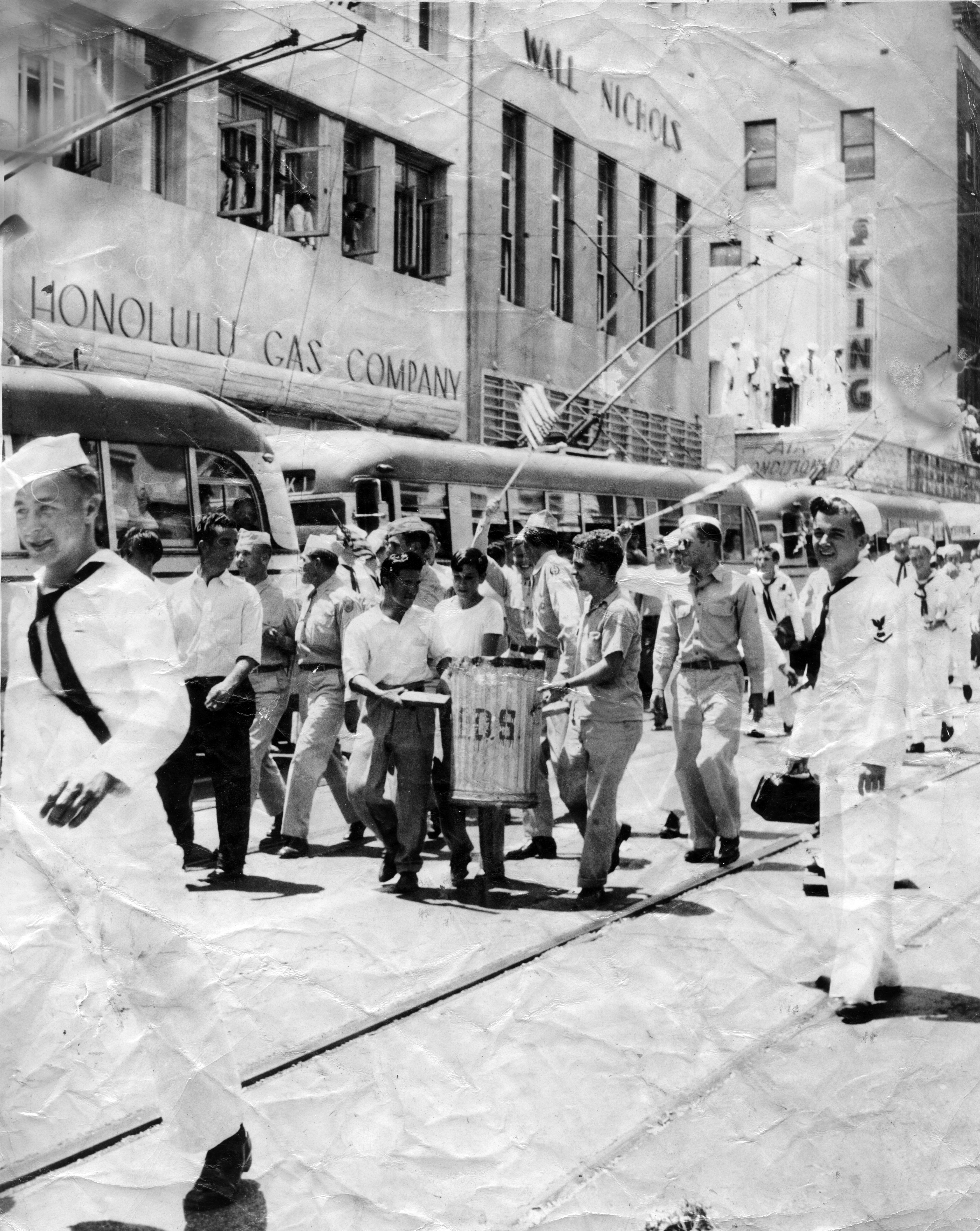 Soldiers, sailors, and civilians celebrating victory over Japan. This appears like some sort of parade pass the Honolulu Gas Company office. Per Wikipedia: Victory over Japan Day (also known as V-J Day, Victory in the Pacific Day, or V-P Day is the day on which Imperial Japan surrendered in World War II, in effect bringing the war to an end. The term has been applied to both of the days on which the initial announcement of Japan's surrender was made 15 August 1945, in Japan, and because of time zone differences, 14 August 1945 (when it was announced in the United States and the rest of the Americas and Eastern Pacific Islands) as well as to 2 September 1945, when the surrender document was signed, officially ending World War II. 15 August is the official V-J Day for the United Kingdom, while the official US commemoration is 2 September. The name, V-J Day, had been selected by the Allies after they named V-E Day for the victory in Europe. On 2 September 1945, formal surrender occurred aboard the battleship USS Missouri in Tokyo Bay. In Japan, 15 August usually is known as the memorial day for the end of the war, but the official name for the day, however, is the day for mourning of war dead and praying for peace. This official name was adopted in 1982 by an ordinance issued by the Japanese government.